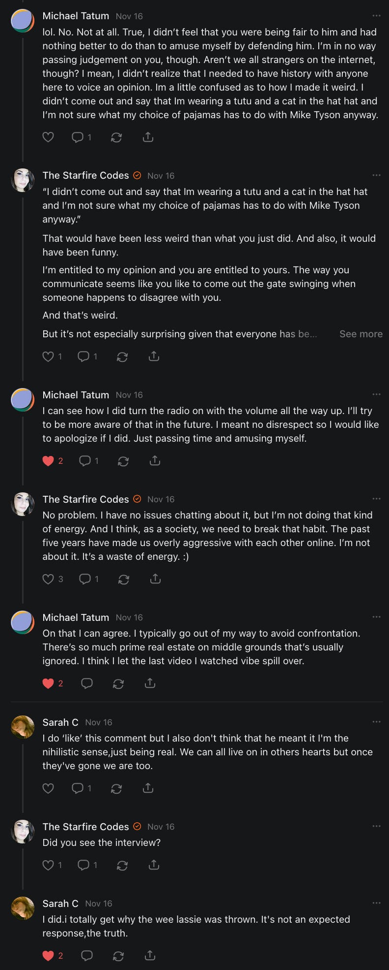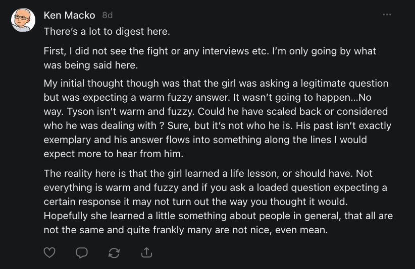 But oddly enough, it was mentioned briefly in a group chat I was hosting, and someone posted a video in that chat of Tyson being interviewed by a very young girl, seemingly a child.