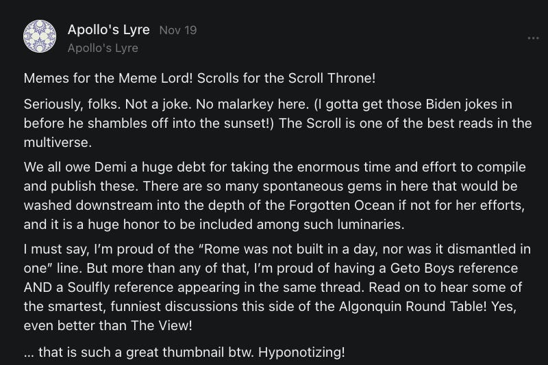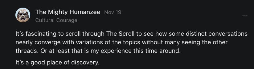 THE SCROLL is a free-form multimedia stream of consciousness digest of interesting, informative, educational, and otherwise amusing posts and conversations from across Substack and amongst Substack writers and readers, carefully curated by the author.