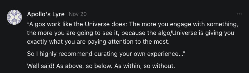 Algos work like the Universe does: The more you engage with something, the more you are going to see it, because the algo/Universe is giving you exactly what you are paying attention to the most.