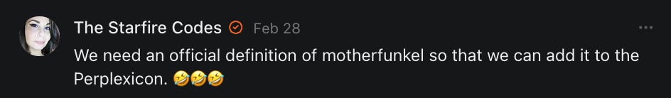 Created by popular demand, THE PERPLEXICON is a glossary of all of the vocabulary words, portmanteautally amazeballs with awesomesauce and otherwise, that we have either acquired from others or concocted ourselves on The Starfire Codes, most notably within the SFC weekly series