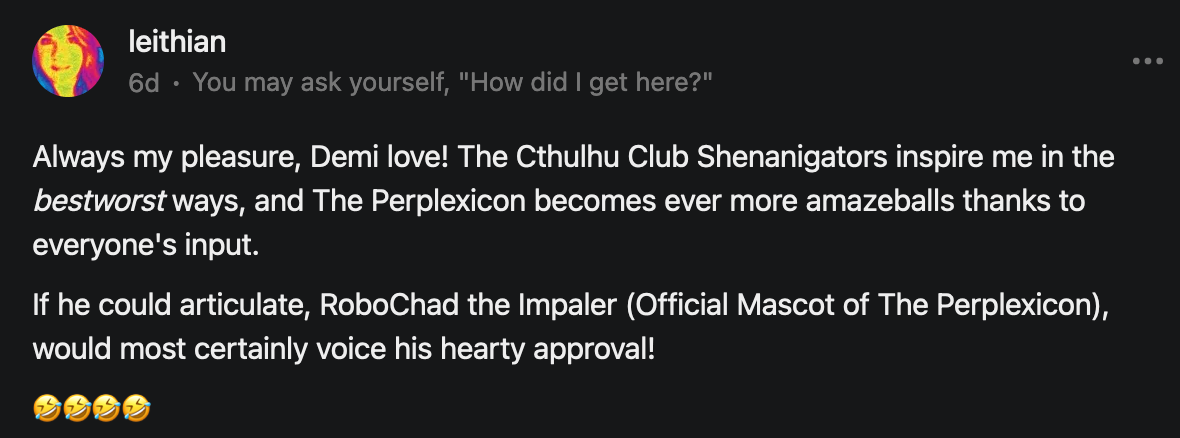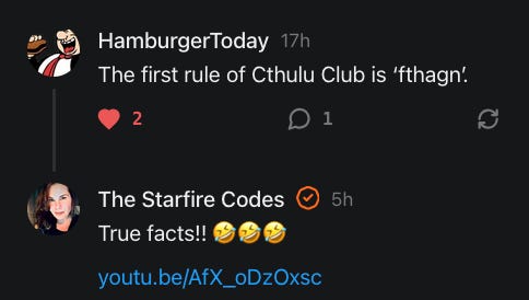 Notes On Cthulhu Club, Darla the Dog, Debanking Diddy, The Perplexing Perplexicon, Scrollars, Pirate Ships and Sea Shanties, This Could Be Us, and more....