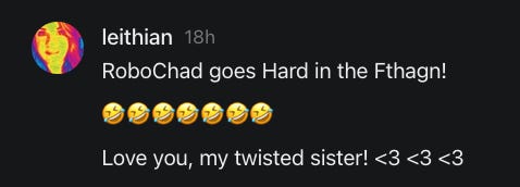 “So I just tried to type "RoboChad" but ended up with "RiboChard" and I'm laughing like a fucking idiot. 🤣🤣🤣 It's his nickname en français.” -