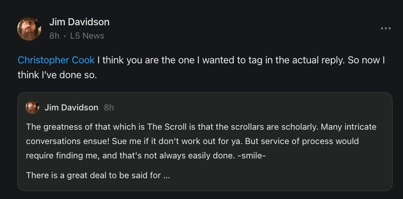 THE SCROLL is a free-form multimedia stream of consciousness digest of interesting, informative, educational, and otherwise amusing posts and conversations from across Substack and amongst Substack writers and readers, carefully curated by the author.