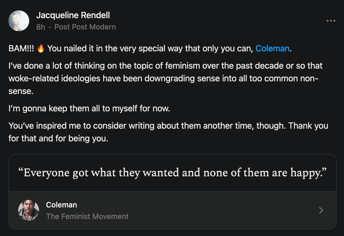 , The Feminist Movement]Well, that’s a can of worms, Coleman. Has your comments section gone vertical yet? 🤣