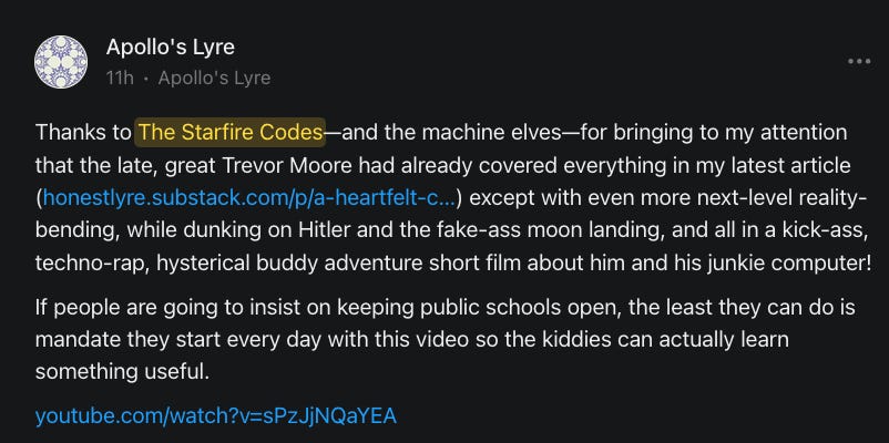 The Starfire Codes produces an audience-supported publication with a stellar podcast, consciousness-expanding daily spiritual content, and well-researched articles on forbidden but crucial topics.