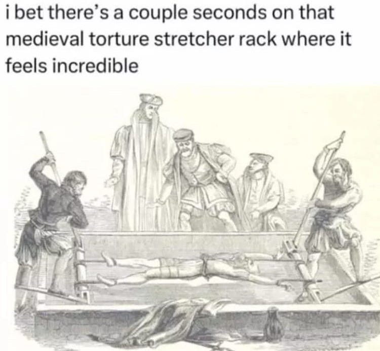 With regard to the torture rack, in chiropractic they call it "traction" and it can be quite pleasant in helping to re-arrange spinal anomalies.