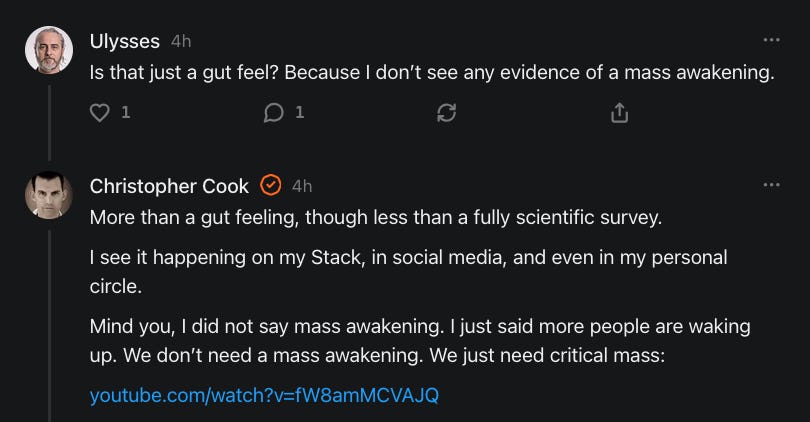 Do we need to tip the scales, as it were, to reach a sufficient number of people attuned to achieve a paradigm shift, or is--at least in one's own sphere of experience--solely a matter of personal conviction and persistence? The latter obviously implies a certain solipsism (which could well be true in my humble opinion, it certainly is notoriously unfalsifiable ha), but I don’t think that neeeeeeed be the case. I think it could also lead to things like essentially Venn overlay reality spheres with an aspect/iteration of each sovereign-soul self "manifesting" in the existential overlaps with other such consciousnesses.