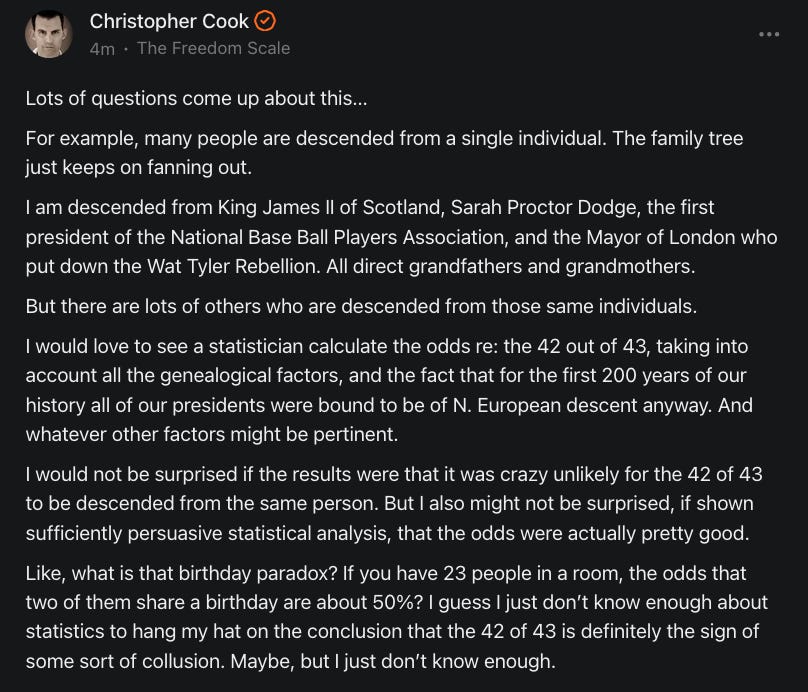 There was a science fair project done by a little girl, 13 years old. I think this was during the Obama administration. She did this science fair project with her grandfather. They were looking into lineage. They traced all of the U.S. presidents back to the same British king, except for one who they traced back to being of French descent. That was Van Buren.