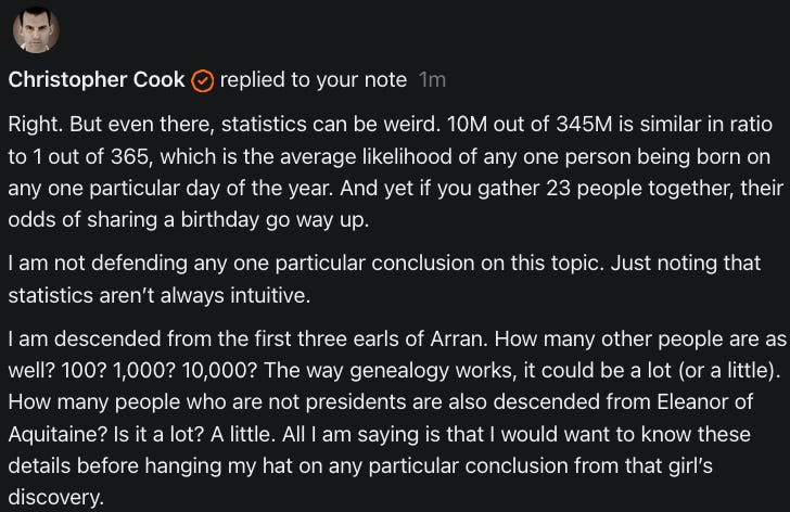 What they failed to do was to look matrilineally. They were looking patrilineally, but had they gone back to Eleanor of Aquitaine. They are all descendants of Eleanor of Aquitaine. I had access to the family tree. So I was able to go there and look at all of this. And sure enough, they all go back to the same person.