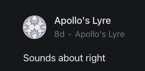 “Thank you thank you. I am always solutions-oriented haha. And I'd forgotten San Fran did that lol. That is peak San Fran problem-solving right there 😂” - Apollo's Lyre
