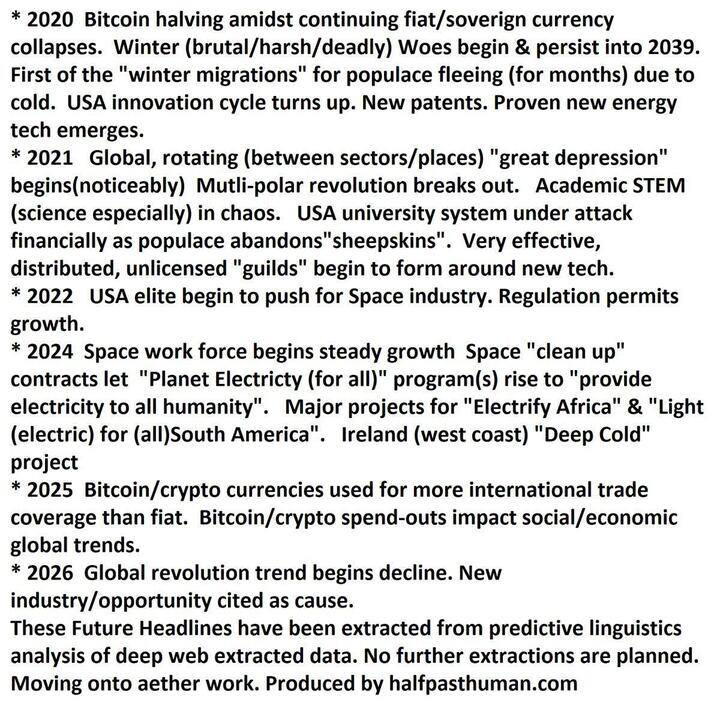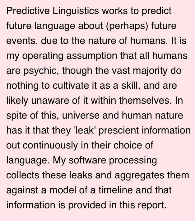 From Clif's old website. He was tracking the occurrences of repetitive linguistic phrases in the zeitgeist with the premise that all humans are slightly psychic. He built these into "Alta" reports, predictions for what would happen in politics, economics, and the crypto markets. Clif stopped making the reports once censorship in online spaces created flaws in the data sets.