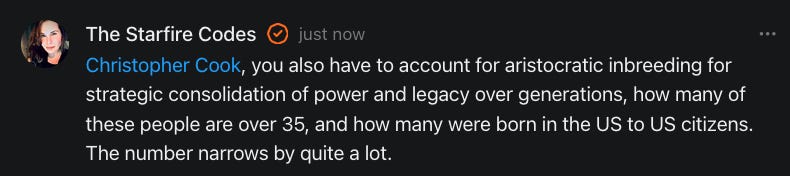 “Yeah, all of that makes sense. But they also just taught their kids to sit up straight and to learn skills and read classic literature and generally to be more accomplished, etc. They took pride in themselves. The “we were born into this position” aspect was gross, but trying to actually be meritoriously worthy was a good goal.” - Christopher Cook