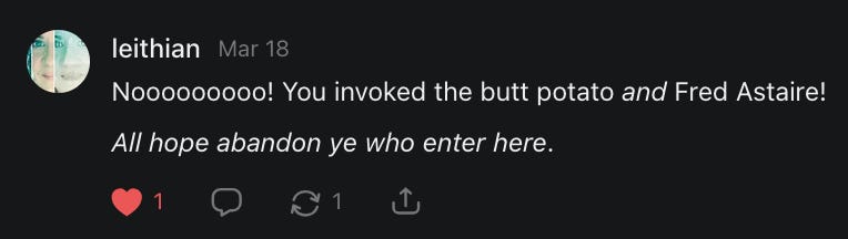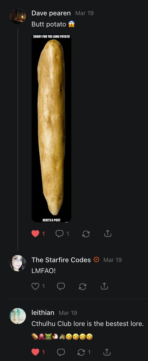 Notes On Shooting Your Shot, Psychopanda, Cthulhu Club, Fred Astaire's Long Scrolling Butt Potatoes, Sparkle Maintenance Protocol, More Freaking Spiders, Random Recipes, Vagina Dentata, and more....