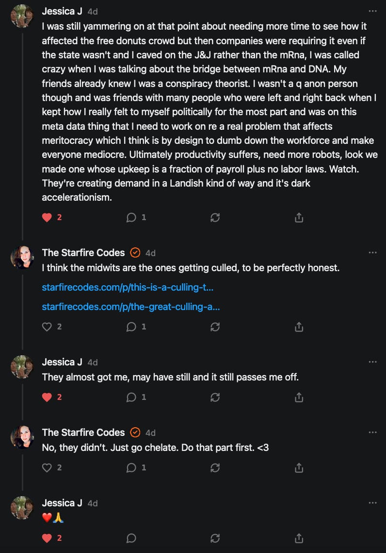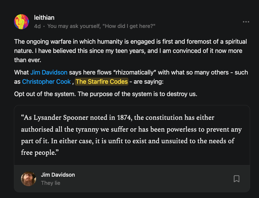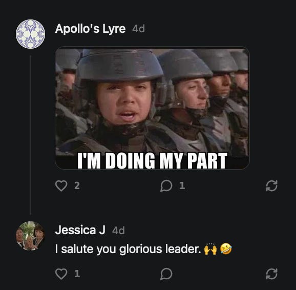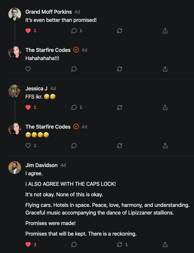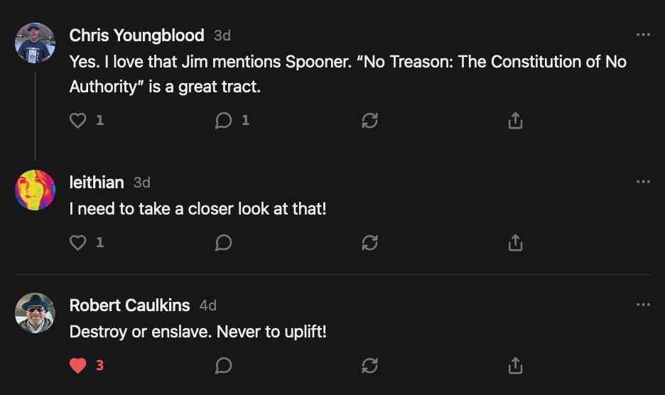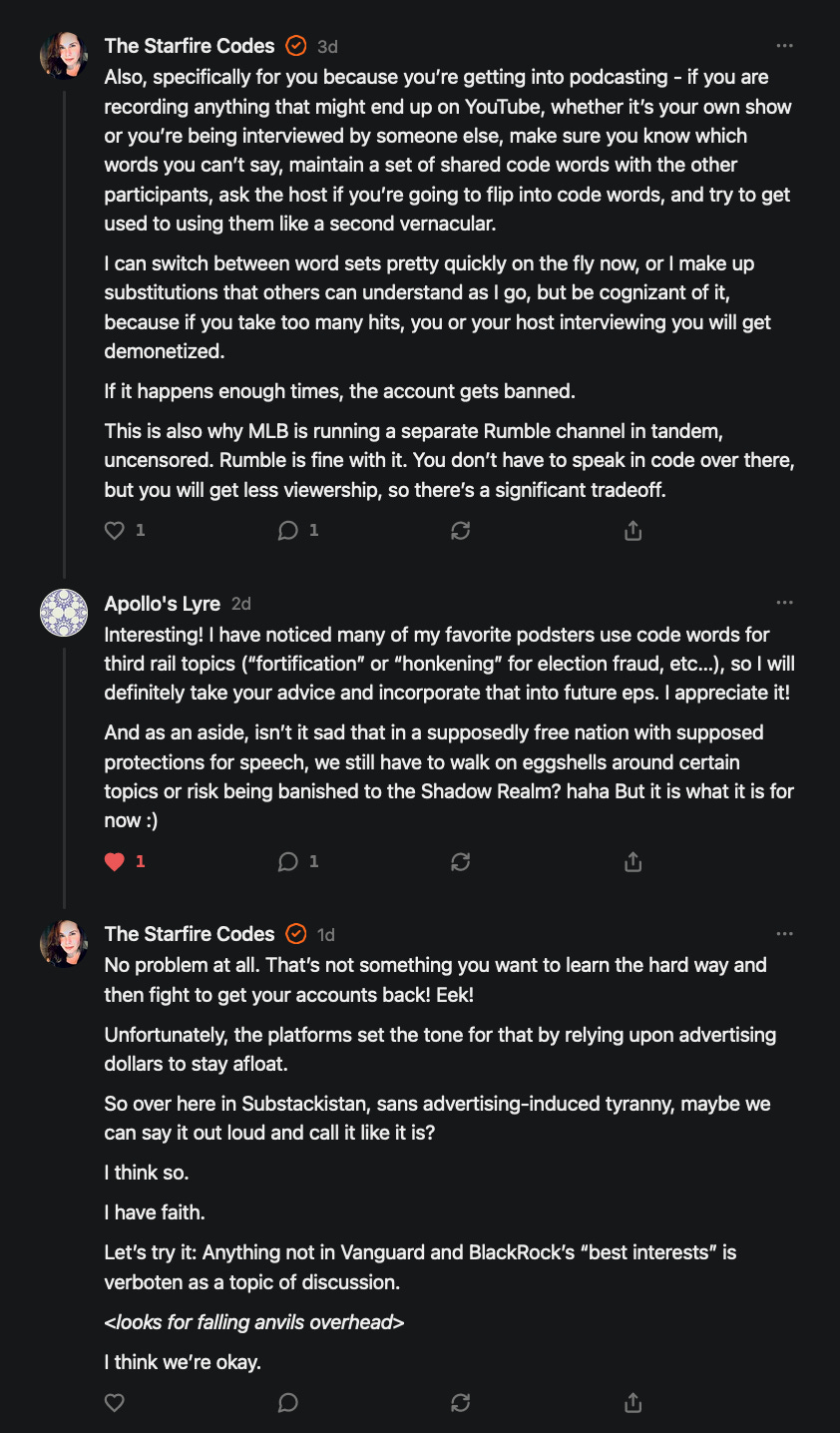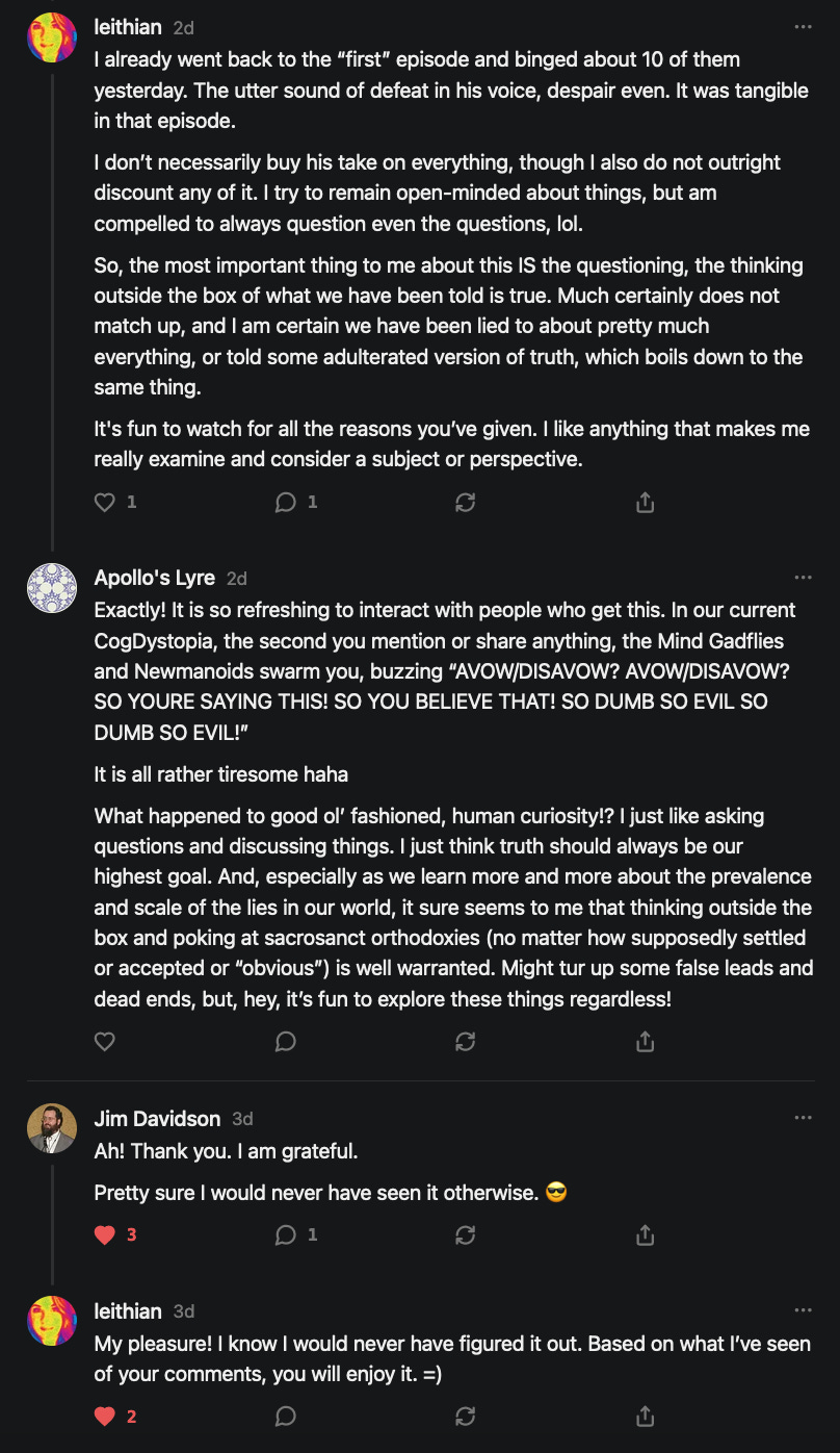 Special thanks to 13/1 NYS CONstitution, Aaron Waddell, Abigail Starke, Agnes, Ahmed’s Stack of Subs, AJ, Alan Lovejoy, Alan Simpson, Al Ballesteros, Alexander Semenyuk, Alex de Carvalho, Alex Ilex, AlgoTradeAlert, AllAboutEve43, Allegories And Inquiries, Amel Figueroa Sanchez, American Dissident, AMP, Amusings, Andre Moss, Andrew, Andrew Beebe, Andrew | Dad Explains, Andy Barnes, Angela Morris, Annette kimball, Annie Mc, Annie Today And Tomorrow, Antila H. Belist, Apollo's Lyre, ArtemisForestFairy, A. Ship, Ash 1952, Atomic Statements, Barbara Wegner, Barry Eby, Bart Caruso, Bill, Bill Lacey, Bill Pocklington, Bill Rice, Jr., Björn Olof Elisson, Blessed Warrior Reina, Blue Ridge Barbarian, Bob, Bob Hannaford, Boflys, Braeden, Brett Dill, Brian Forkum, BugGoo, Cameron M. Bailey, Caroline Lindon, Cape Coral Tony, Carolina Uribe, Cat Krilov, Cherri Vieau, cholli, Chris Frick, Chris Hall, Christina Gerrard, Chris Youngblood, Cinder, Clee Images, Coco McShevitz, Coleman, Colin Elliott, Connecting The Dots, Contrary to Ordinary, Cori Bren, Cygnus X-1, DancingInAshes, Daniela Tatz, Daniel W. Marshall, Danway, Darius, Dave, Dave Graziano, Dave Kunzelman, Dave pearen, David Reed, Dawn Bernard, Deborah Clark, Deborah T. Hewitt, Dee Rambeau, Dennis T., Dennis Wilson, Dharma Rose, Dianne, Dissentious Skwrl, Doctor Kitt, Dog, DoG, Don, Dookie Boi LaCroix, Dorothy Unleashed, Dr.Who, Duchessa Lia, Duke1832, dwtruthwarrior, Edward E Campbell, El doctor, Elizabeth Kelsey, Elizabeth Neville, ElRey_Congo, Elsie E Connelly, Emily, Emily M, Eric Brown, Eric Coppala, Erik Hogan, Fil666, Fizzy, FOOL, Forest Myers, Frank Barone, Fukitol, Gabriel, Geno Merryman, Germaine Lambergs, Gilgamech, Ginger Cook, GO, Grand Moff Porkins, Grand Schemes, Greg Snow, G. T. A. Ogle, Guy S. Waltman, HamburgerToday, Hannah Francesca, Hannahlore Trickett, Hannah Rose Williams, Heather B, Hege Kristoffersen, HFO (thepixieminx), Holly, Hugh Mercer, i3utm, Iam Weare, Ian, Ian Michael Lessard, IPR with Mack Morris, Iseeit, Jace, Jack, Jack Backes, Jackie J, Jackieone, Jacob Clarke, Jacqueline Rendell, Jake Purvis, James Costello, James Kirira, James True, Jane, Jason, Jen Goldman, M.A, Jenn, Jeremy Mercier, Jerome Armstrong, Jessica J, Jim Davidson, JM, Joe Bulls, Joel, Joel S Turrentine, Joe Reiter, John, John Mistretta, Johnny J. Johnson Jr. Esq., John Seaman, Johnstone75, Jonathan Fletcher, Jonathon, Joseph Hex, Joseph Montenegro, Joseph Saltzar, Josh Slocum, Joshua T Calkins-Treworgy, Joyce, JP Spatzier, JRCCreasey, J.S. Kasimir, Judson Stacy Vereen, Julie Fowler BA MA FCIM, Jweli, Kalihi Valley Druid, Karen Lynch, Karen P, Kat, Katherine Blair, Kath Lauderdale, Katy Marriott, Kay, Kaya Marie, Kelly Knight, Ken Barber, Ken Macko, Kenneth R. Mintz, Kerry, Kevin Bass, Kevin kenneth koehnke, Kevin Nash, Keziah_Soj, Kobalevsky 42, Koshmarov, Kristi Hadix, KSBfx 2020, Kyle Kissinger (no relation), Lady Libidex, Laura K, Lee, leithian, Lerville, Lia, libertà, Librarian of Celaeno, Liz, Liz Zimmers, Louise Tozzi, Love, Lucianna Aislynn, M7reads, MacGuffin, Maggie, MaKenna Grace, Mana Satto, Marie Christina Nørgård, MariKate, Marilyn S, MargaritasattheMall, Mark Blanda, Mark McIntire, Mark Roemers, martha, Martin Lewis, Martinus, Mary Dee, Mason, Storyteller, Matthew, Matthew Haviland, Matthew Thompson, Matt Taibbi, Max Clark, Melissa Petrie, Merry Edwards, Michael Hermens, Michael Newberry, Michael Rader, Michael S. Alford, Michael Woudenberg, Michelle Lobdell, Miep, Mike Kay, Missives From The Quantum, mg, M Le Baron, Morgthorak the Undead, Mr Nobody, MRT’s Haircut, MuggsSpongedice, M. V.M. 718, Mystic William, Nancy Boyd, Nancye, Nancy G, Nani Lani, Nate Winchester, Nathalie Martinek PhD, Nelo, nESSie, NHNEC, Nikkinike, Noah Goldstein, None Of Your Business, NotaBot, NOT Today, Nurse Kristin, Obsidian Blackbird., Odin ⚜️, Over_by_art_Minnesota, overflowing ashtray, Özge, Paolo Peralta, Patrick Morton, Patrick Muindi, Pat Spano, Paula Lynn Hay, Paul Kirwin, Peg Forbes, Peregrinus, Peter Bullard, Phi Eridani, polistra, qangin, Queue the Revolution, Rachel Cheeney, Randy Lessley, RANDY O’TOOLE, Rascal Nick Of, Rat, Ray Butler, ReadingRainbow, Reuben Salsa, Richard Nielsen, Rick Spencer, ric leczel, Rob, Robbie Newport, Robert cates, Robert Caulkins, Rob Watkins, Roger, Rosemary B, Russell Gold, Ruth Dupre, Ruth H, Ryan Williams, Sally, Sam, Sandra Combs, Sarah C, Sarah Powell, Sasha Stone, Sasha V, Scott, Scott Halverson, Scott MacInnis, Scott Uhrmann, ScrewWorm, Sean, Selina Rifkin, s.e.t.h, Shannon, Sharon Wilson, Shauna K. Hunt, Sigma Jedi, Silver Bear, Silver Warrior, Simon Tanner, Singing in the Dark, Slogger, S Mooney, Snunya B. Inniss, Solarah, SpandX, Starr O'Hara, Star Sourcer, Stay Sane Substack, StClair Tweedie, Stella Bell, Stephanie, St. Ignatius, Stone Bryson, Sue Charles-Hendy, Suzanne, SVour, Tara, Terrence Gideon, Teuta Blackman, Thea, TheAbjectLesson, The Bone Writer, The Brothers Krynn, The Dissident in Us, The Ignorant Ninja, the long warred, The Lurking Ophelia, Theodore Atkinson, The Shadow Band, Timothy Andrew Staples/pop122, Tina Hancock, T.J. Hattor, Tom Slick, Tonioconni, Toobguy47, TPWSYL, Trevor England Q., trhinz, Trudi Nicola, Tyler Bledsoe, Unapologeticallyyourstruly, Uncouth Barbarian, Vance Gatlin, Van Ivey, Victory Palace, Vulkan, Waylon, William Hunter Duncan, Your Friend Dave, and Zenitheus for inspiring these responses and the subsequent posts and conversations.