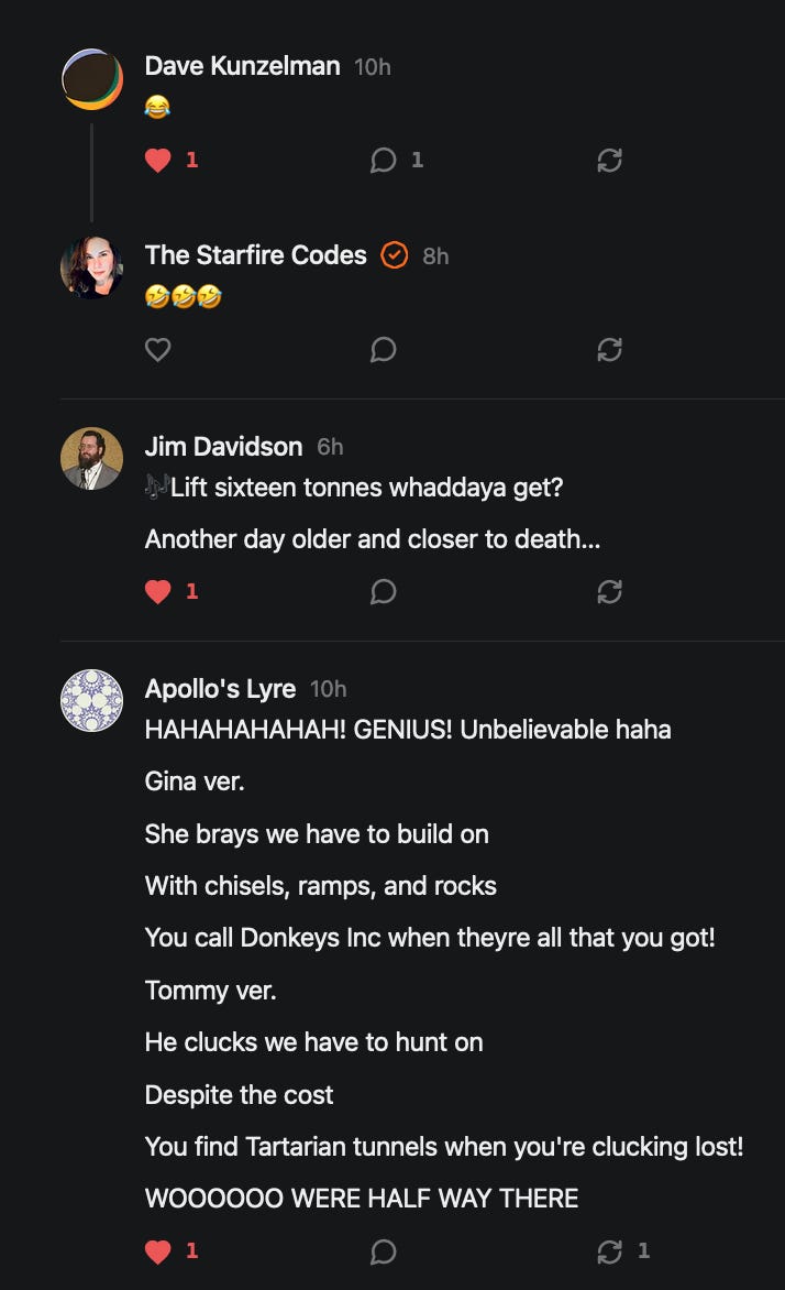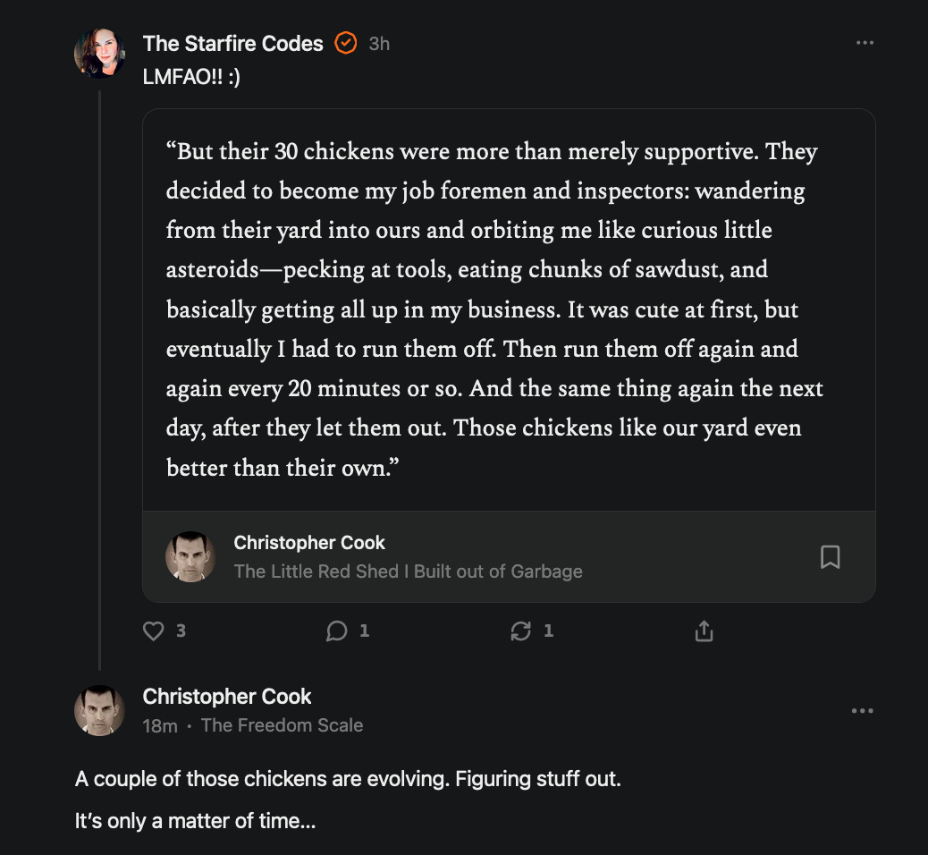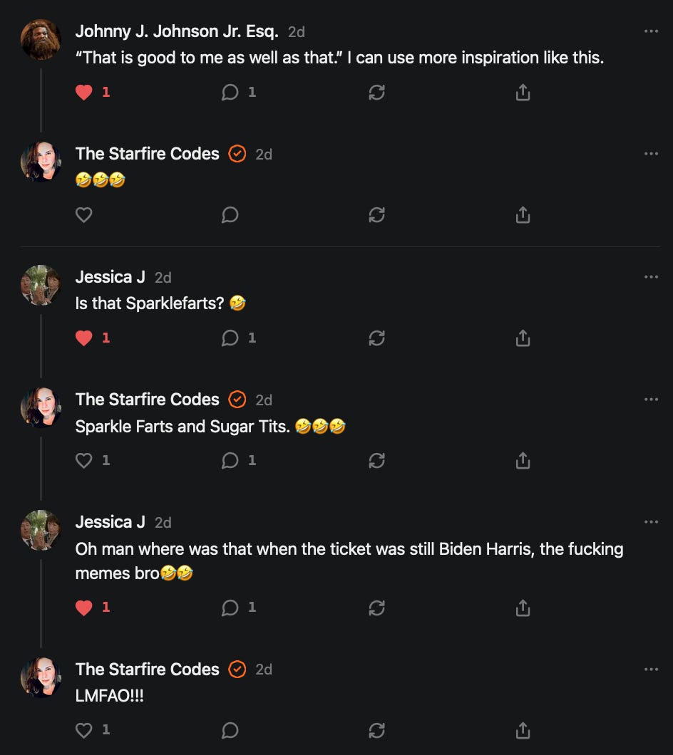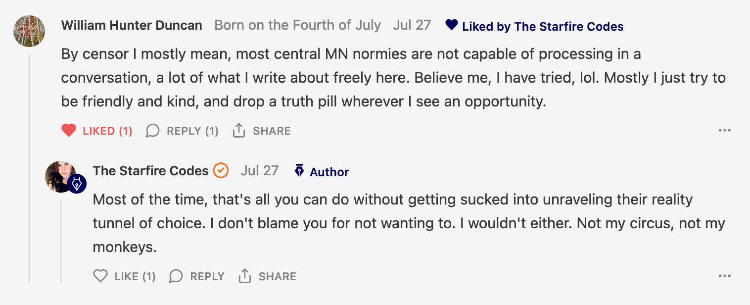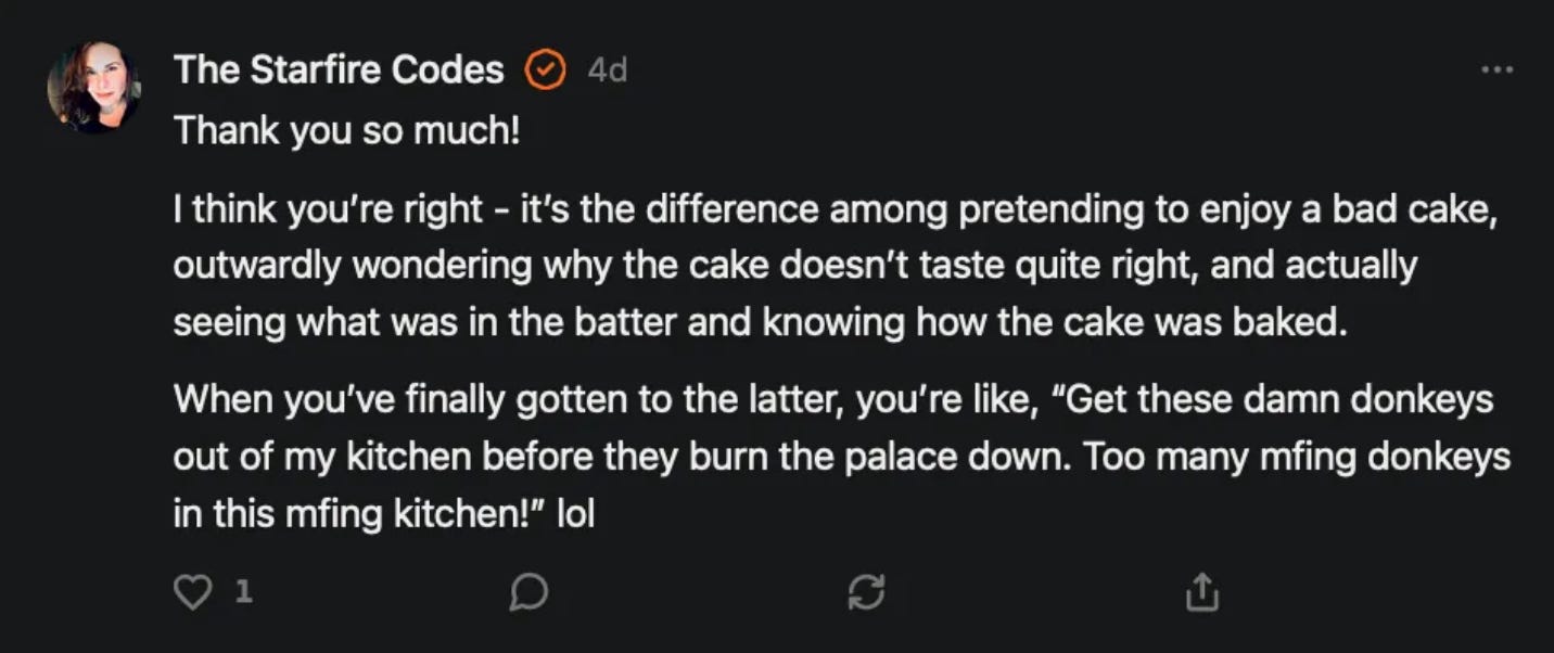 Special thanks to 13/1 NYS CONstitution, Aaron Waddell, Abigail Starke, Agnes, Ahmed’s Stack of Subs, AJ, Alan Lovejoy, Alan Simpson, Al Ballesteros, Alexander Semenyuk, Alex de Carvalho, Alex Ilex, AlgoTradeAlert, AllAboutEve43, Allegories And Inquiries, Amel Figueroa Sanchez, American Dissident, AMP, Amusings, Andre Moss, Andrew, Andrew Beebe, Andrew | Dad Explains, Andy Barnes, Angela Morris, Annette kimball, Annie Mc, Annie Today And Tomorrow, Antila H. Belist, Apollo's Lyre, ArtemisForestFairy, A. Ship, Ash 1952, Atomic Statements, Barbara Wegner, Barry Eby, Bart Caruso, Bill, Bill Lacey, Bill Pocklington, Bill Rice, Jr., Björn Olof Elisson, Blessed Warrior Reina, Blue Ridge Barbarian, Bob, Bob Hannaford, Boflys, Braeden, Brett Dill, Brian Forkum, BugGoo, Cameron M. Bailey, Caroline Lindon, Cape Coral Tony, Carolina Uribe, Cat Krilov, Cherri Vieau, cholli, Chris Frick, Chris Hall, Christina Gerrard, Chris Youngblood, Cinder, Clee Images, Coco McShevitz, Coleman, Colin Elliott, Connecting The Dots, Contrary to Ordinary, Cori Bren, Cygnus X-1, DancingInAshes, Daniela Tatz, Daniel W. Marshall, Danway, Darius, Dave, Dave Graziano, Dave Kunzelman, Dave pearen, David Reed, Dawn Bernard, Deborah Clark, Deborah T. Hewitt, Dee Rambeau, Dennis T., Dennis Wilson, Dharma Rose, Dianne, Dissentious Skwrl, Doctor Kitt, Dog, DoG, Don, Dookie Boi LaCroix, Dorothy Unleashed, Dr.Who, Duchessa Lia, Duke1832, dwtruthwarrior, Edward E Campbell, El doctor, Elizabeth Kelsey, Elizabeth Neville, ElRey_Congo, Elsie E Connelly, Emily, Emily M, Eric Brown, Eric Coppala, Erik Hogan, Fil666, Fizzy, FOOL, Forest Myers, Frank Barone, Fukitol, Gabriel, Geno Merryman, Germaine Lambergs, Gilgamech, Ginger Cook, GO, Grand Moff Porkins, Grand Schemes, Greg Snow, G. T. A. Ogle, Guy S. Waltman, HamburgerToday, Hannah Francesca, Hannahlore Trickett, Hannah Rose Williams, Heather B, Hege Kristoffersen, HFO (thepixieminx), Holly, Hugh Mercer, i3utm, Iam Weare, Ian, Ian Michael Lessard, IPR with Mack Morris, Iseeit, Jace, Jack, Jack Backes, Jackie J, Jackieone, Jacob Clarke, Jacqueline Rendell, Jake Purvis, James Costello, James Kirira, James True, Jane, Jason, Jen Goldman, M.A, Jenn, Jeremy Mercier, Jerome Armstrong, Jessica J, Jim Davidson, JM, Joe Bulls, Joel, Joel S Turrentine, Joe Reiter, John, John Mistretta, Johnny J. Johnson Jr. Esq., John Seaman, Johnstone75, Jonathan Fletcher, Jonathon, Joseph Hex, Joseph Montenegro, Joseph Saltzar, Josh Slocum, Joshua T Calkins-Treworgy, Joyce, JP Spatzier, JRCCreasey, J.S. Kasimir, Judson Stacy Vereen, Julie Fowler BA MA FCIM, Jweli, Kalihi Valley Druid, Karen Lynch, Karen P, Kat, Katherine Blair, Kath Lauderdale, Katy Marriott, Kay, Kaya Marie, Kelly Knight, Ken Barber, Ken Macko, Kenneth R. Mintz, Kerry, Kevin Bass, Kevin kenneth koehnke, Kevin Nash, Keziah_Soj, Kobalevsky 42, Koshmarov, Kristi Hadix, KSBfx 2020, Kyle Kissinger (no relation), Lady Libidex, Laura K, Lee, leithian, Lerville, Lia, libertà, Librarian of Celaeno, Liz, Liz Zimmers, Louise Tozzi, Love, Lucianna Aislynn, M7reads, MacGuffin, Maggie, MaKenna Grace, Mana Satto, Marie Christina Nørgård, MariKate, Marilyn S, MargaritasattheMall, Mark Blanda, Mark McIntire, Mark Roemers, martha, Martin Lewis, Martinus, Mary Dee, Mason, Storyteller, Matthew, Matthew Haviland, Matthew Thompson, Matt Taibbi, Max Clark, Melissa Petrie, Merry Edwards, Michael Hermens, Michael Newberry, Michael Rader, Michael S. Alford, Michael Woudenberg, Michelle Lobdell, Miep, Mike Kay, Missives From The Quantum, mg, M Le Baron, Morgthorak the Undead, Mr Nobody, MRT’s Haircut, MuggsSpongedice, M. V.M. 718, Mystic William, Nancy Boyd, Nancye, Nancy G, Nani Lani, Nate Winchester, Nathalie Martinek PhD, Nelo, nESSie, NHNEC, Nikkinike, Noah Goldstein, None Of Your Business, NotaBot, NOT Today, Nurse Kristin, Obsidian Blackbird., Odin ⚜️, Over_by_art_Minnesota, overflowing ashtray, Özge, Paolo Peralta, Patrick Morton, Patrick Muindi, Pat Spano, Paula Lynn Hay, Paul Kirwin, Peg Forbes, Peregrinus, Peter Bullard, Phi Eridani, polistra, qangin, Queue the Revolution, Rachel Cheeney, Randy Lessley, RANDY O’TOOLE, Rascal Nick Of, Rat, Ray Butler, ReadingRainbow, Reuben Salsa, Richard Nielsen, Rick Spencer, ric leczel, Rob, Robbie Newport, Robert cates, Robert Caulkins, Rob Watkins, Roger, Rosemary B, Russell Gold, Ruth Dupre, Ruth H, Ryan Williams, Sally, Sam, Sandra Combs, Sarah C, Sarah Powell, Sasha Stone, Sasha V, Scott, Scott Halverson, Scott MacInnis, Scott Uhrmann, ScrewWorm, Sean, Selina Rifkin, s.e.t.h, Shannon, Sharon Wilson, Shauna K. Hunt, Sigma Jedi, Silver Bear, Silver Warrior, Simon Tanner, Singing in the Dark, Slogger, S Mooney, Snunya B. Inniss, Solarah, SpandX, Starr O'Hara, Star Sourcer, Stay Sane Substack, StClair Tweedie, Stella Bell, Stephanie, St. Ignatius, Stone Bryson, Sue Charles-Hendy, Suzanne, SVour, Tara, Terrence Gideon, Teuta Blackman, Thea, TheAbjectLesson, The Bone Writer, The Brothers Krynn, The Dissident in Us, The Ignorant Ninja, the long warred, The Lurking Ophelia, Theodore Atkinson, The Shadow Band, Timothy Andrew Staples/pop122, Tina Hancock, T.J. Hattor, Tom Slick, Tonioconni, Toobguy47, TPWSYL, Trevor England Q., trhinz, Trudi Nicola, Tyler Bledsoe, Unapologeticallyyourstruly, Uncouth Barbarian, Vance Gatlin, Van Ivey, Victory Palace, Vulkan, Waylon, William Hunter Duncan, Your Friend Dave, and Zenitheus for inspiring these responses and the subsequent posts and conversations.