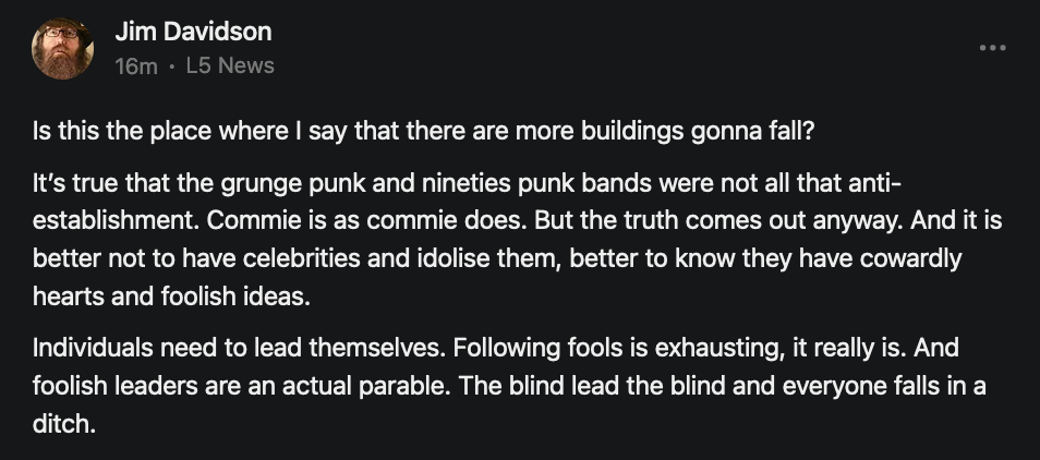 [In response to “While I was composing this message I received from author Matt Taibbi of Racket News this essay on the related topic of “Meet the New Lies, Same as the Old Lies.” So I wanted to include the link because the topic is on the minds of many of us. It is what our friend Demi Pietchell calls a “rhizomatic” connexion - ideas are in play and people are talking and writing about them. We are, after all, each connected to God through our souls.” - Jim Davidson, They Lie]