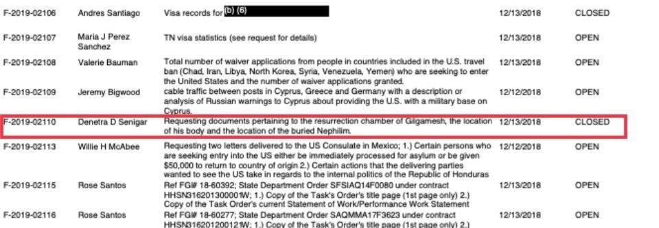 “Requesting documents pertaining to the resurrection chamber of Gilgamesh, the location of his body and the location of the buried Nephilim.” (A “resurrection chamber” is the tech they use to make med beds.)