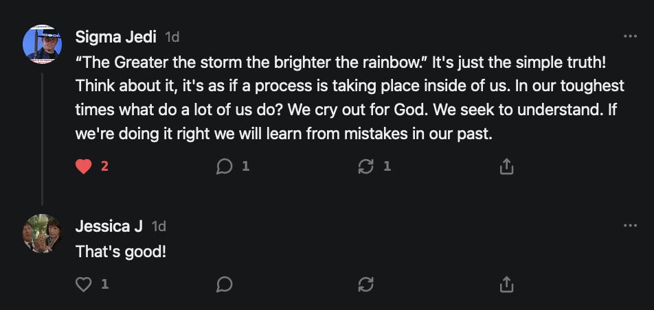 [In response to The Greater The Storm, The Brighter The Rainbow.]