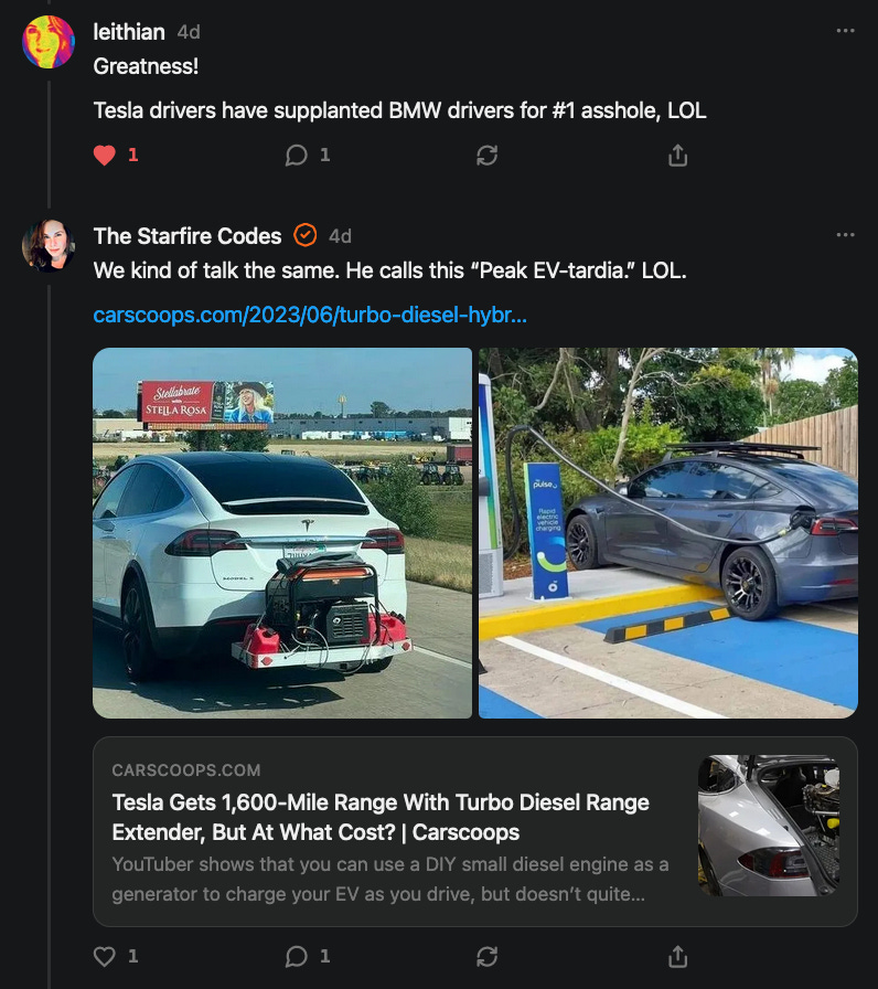 Gray, A. (2023). Guy puts gas generator in his Tesla to avoid plugging it in during road trip. SupercarBlondie.