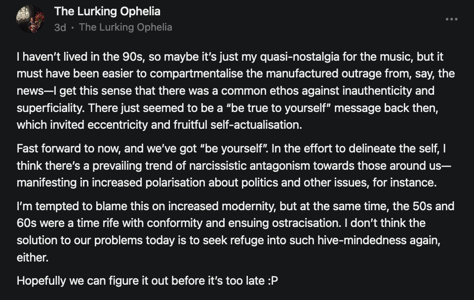 And when you have echoes of inner pain like this and you feel like some unspoken part of yourself is expressed through the words and the images that other artists were using to exorcise similar familiar pain demons, you can get addicted to using their work as a method by which to tear open the wounds with nostalgia, looking for some kind of catharsis, some kind of release.