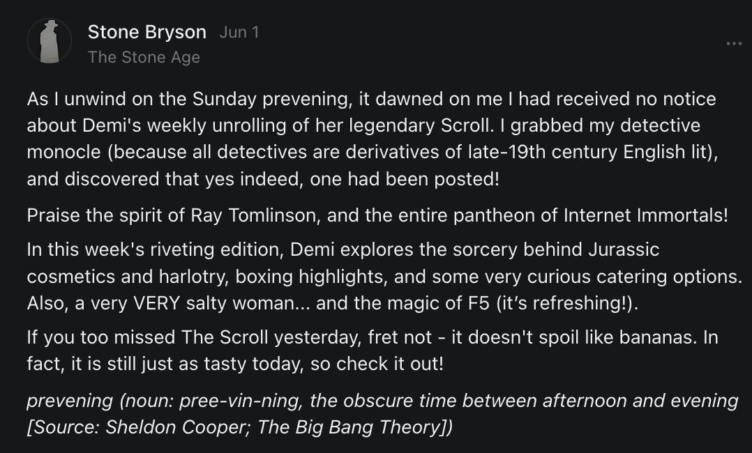 THE SCROLL is a weekly free-form multimedia stream of consciousness digest of interesting, informative, educational, and otherwise amusing posts and conversations from across Substack and amongst Substack writers and readers, carefully curated by the author.