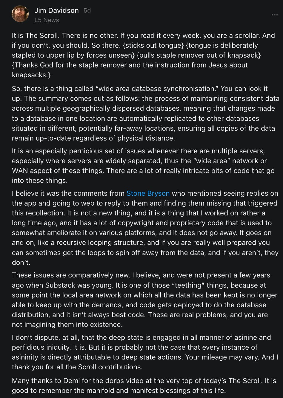 THE SCROLL is a free-form multimedia stream of consciousness digest of interesting, informative, educational, and otherwise amusing posts and conversations from across Substack and amongst Substack writers and readers, carefully curated by the author.
