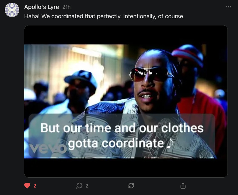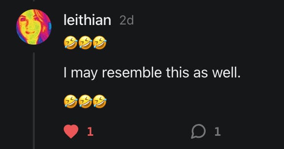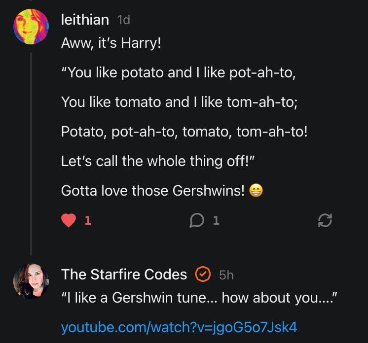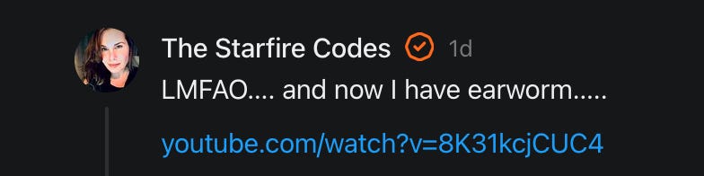 “I love all of this- especially the hilarious parts. And I appreciate all the nuance involved in this multi-faceted, ever-expanding fractal of a topic. Good vibes being sent for Charlie!! ❤️❤️❤️. I suppose a distinction to zoom in on is that of using a digital tools for music-making vs writing lyrics meant to me a mode of emotive expression. But then again so is music. So…..🤷♀️” -