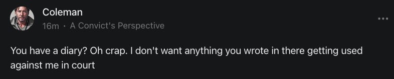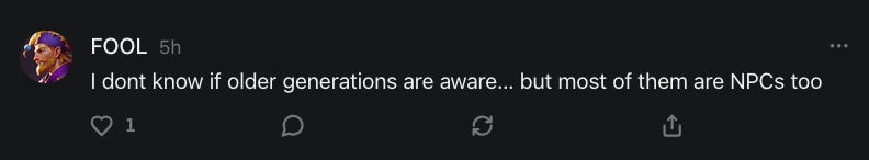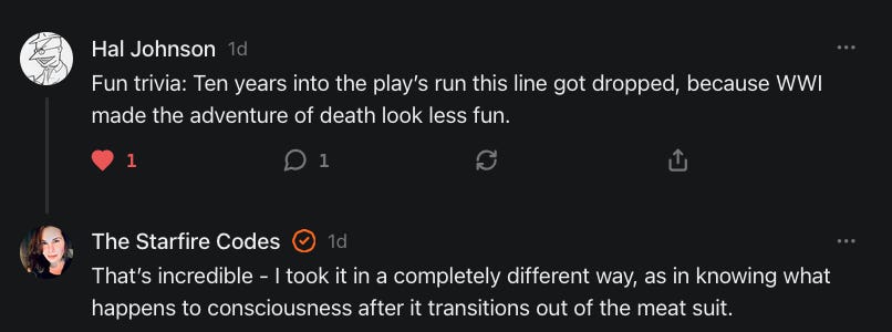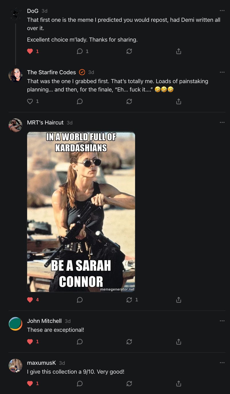 Anyways, no worries if you don't feel like reading that linked novella there or if it isn't your cup of tea, Earl Grey, hot haha. And I did make a conscious effort to lean into a positive/optimist postion for tonal, thematic purposes, which is genuine, though I hope I still struck some balance. As I mention in subsequent convos with Demi, I am painfully aware of the negative/pessimist arguments, particularly in light of our apparent ever-devolving, techno-reliant, Brave New Underclass of humanity and the glee with which globalist technomancers, like High Priest Harari, seem to wield such potential boons to instead to further degrade and control the tired, poor, huddled masses. As I said then, and I will say now: this is why we can't have nice things :)