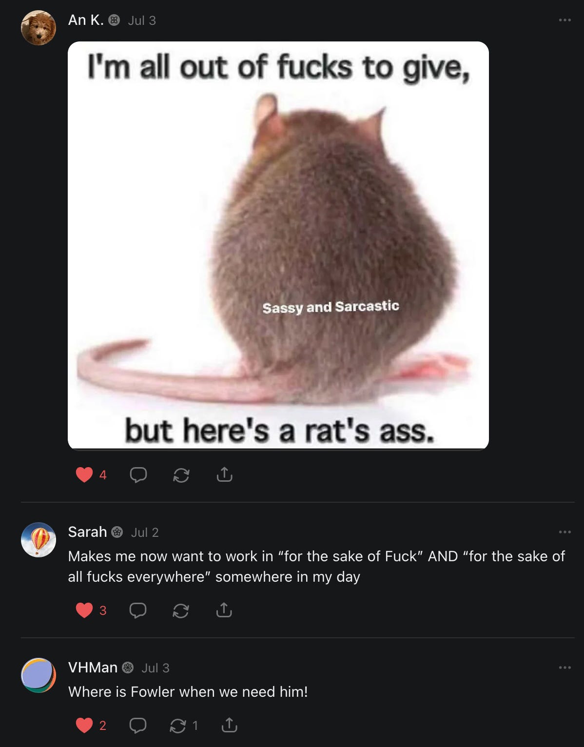 Speaking of a rat's ass, a rat's ass got caught in my chicken coop netting and his ass it petrifying before my eyes and I am not untangling it so every morning when I let the birds out I look at a rat's ass who thought he was sassy and clever...but he was not.