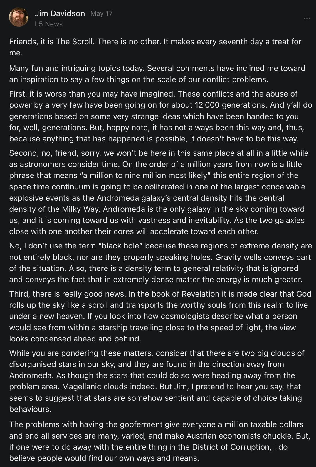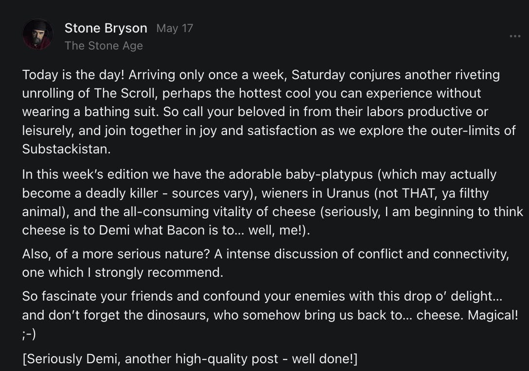 THE SCROLL is a weekly free-form multimedia stream of consciousness digest of interesting, informative, educational, and otherwise amusing posts and conversations from across Substack and amongst Substack writers and readers, carefully curated by the author.