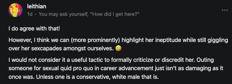 First of all, it’s pretty low, rude, lewd and denigrating, and makes us look like shallow, sex-obsessed incels (just like Woketards love to present us). Do we really need to give them that favor and to act like ones? We could - and should - be much better than that, and shouldn’t denigrate the whole discourse to bed level.