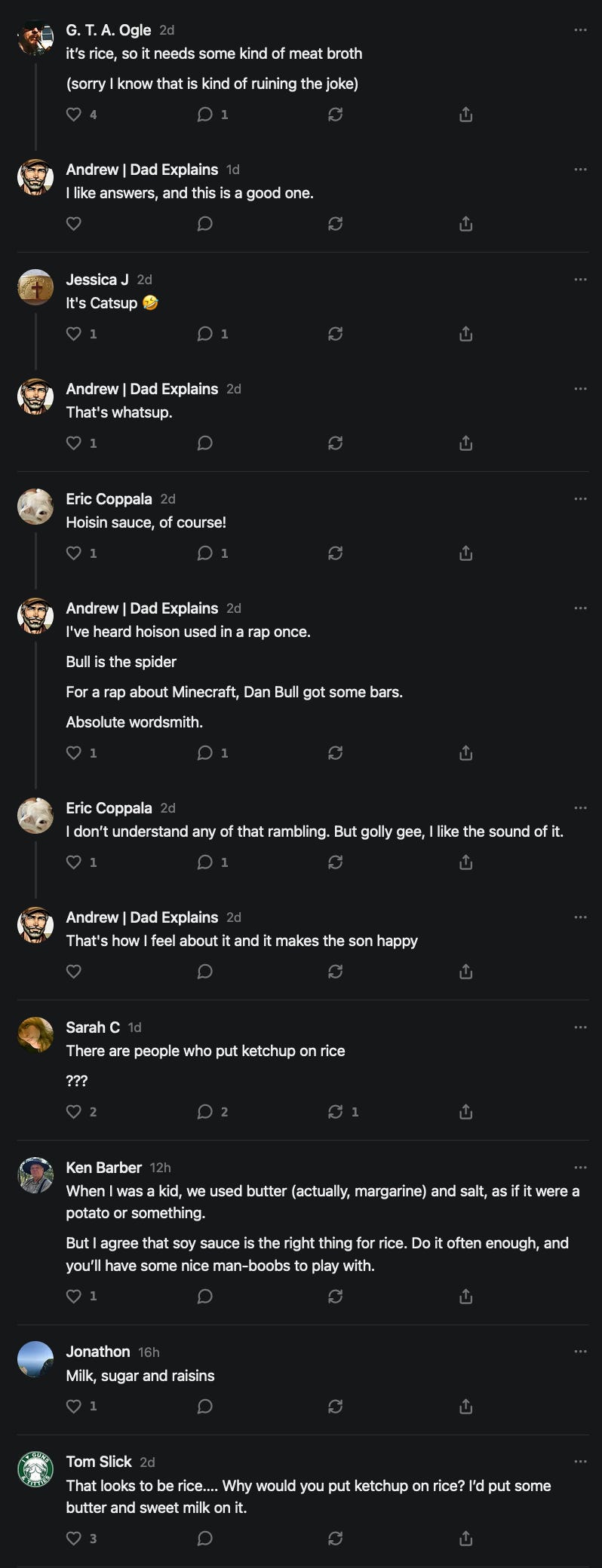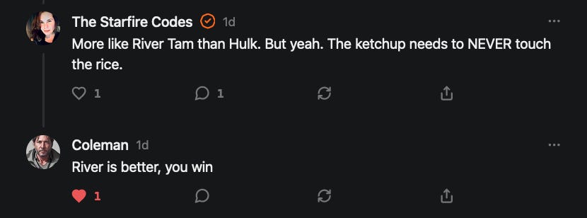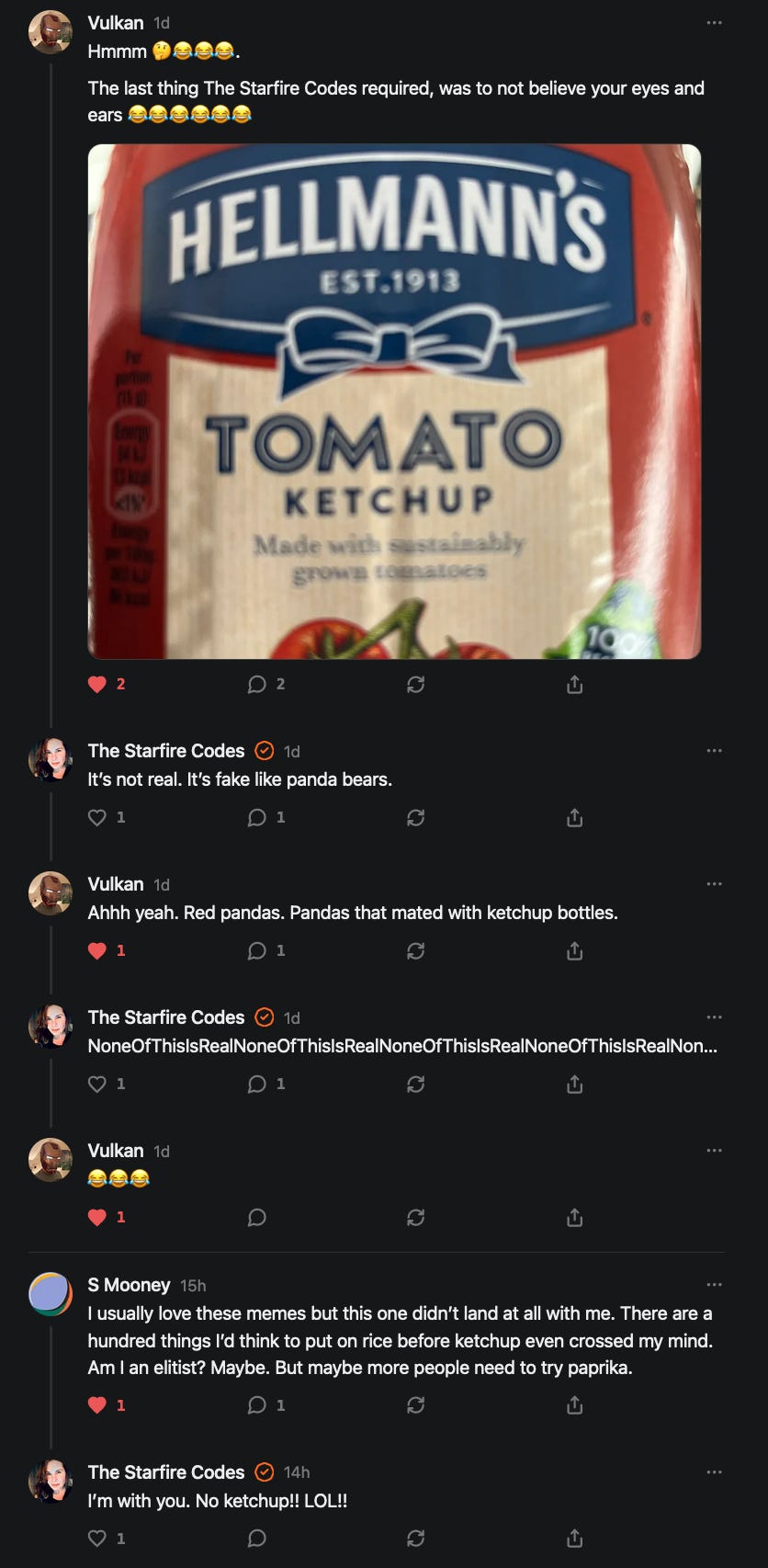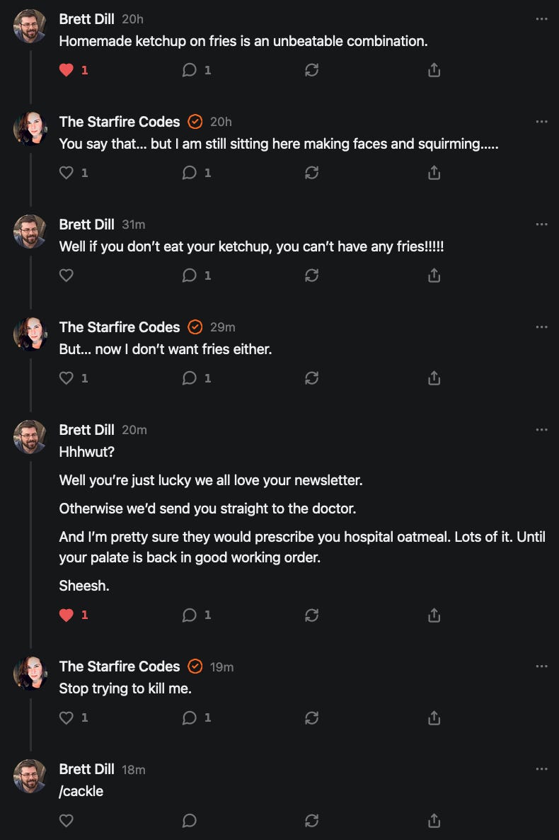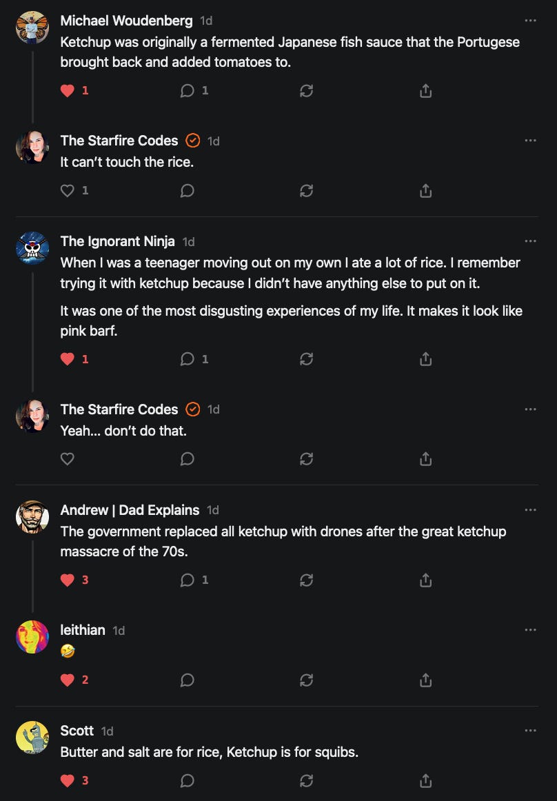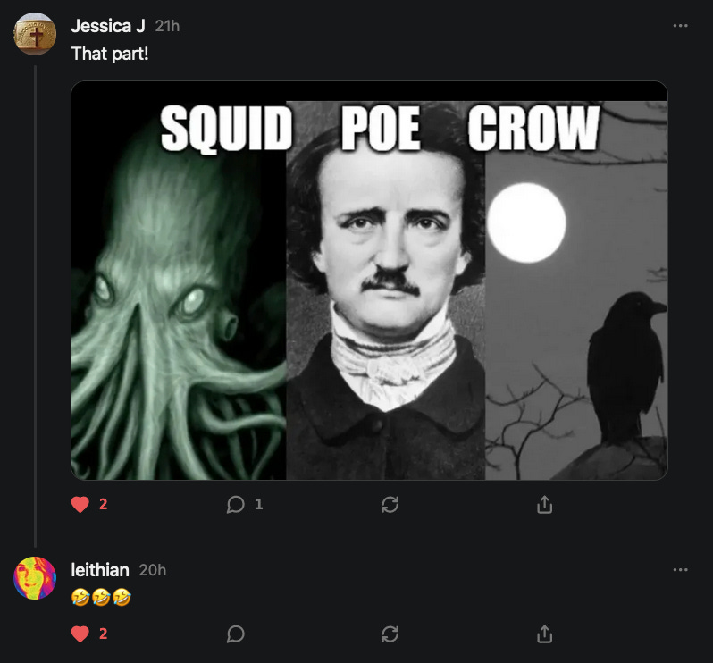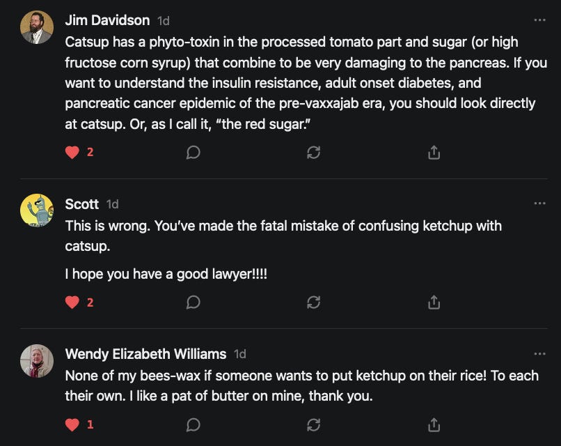 Squid Poe Crow, Word Salad Dressing......I just got an ab workout because I can't stop laughing.....now I have to make time to watch a video about white ketchup.....isn't it ketsup? or Catsup? ...Ketchup feels mandala effect'ish.....what's happening, what's Ketching Up to what? LOL! Did i make that up? I swear it said that on the bottle growing up? What year did we just travel to in some kind of Substackian Time Machine?