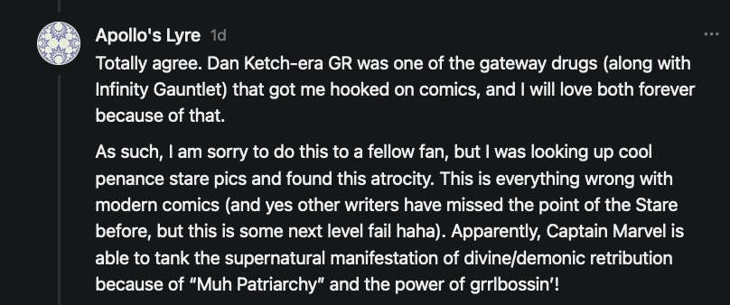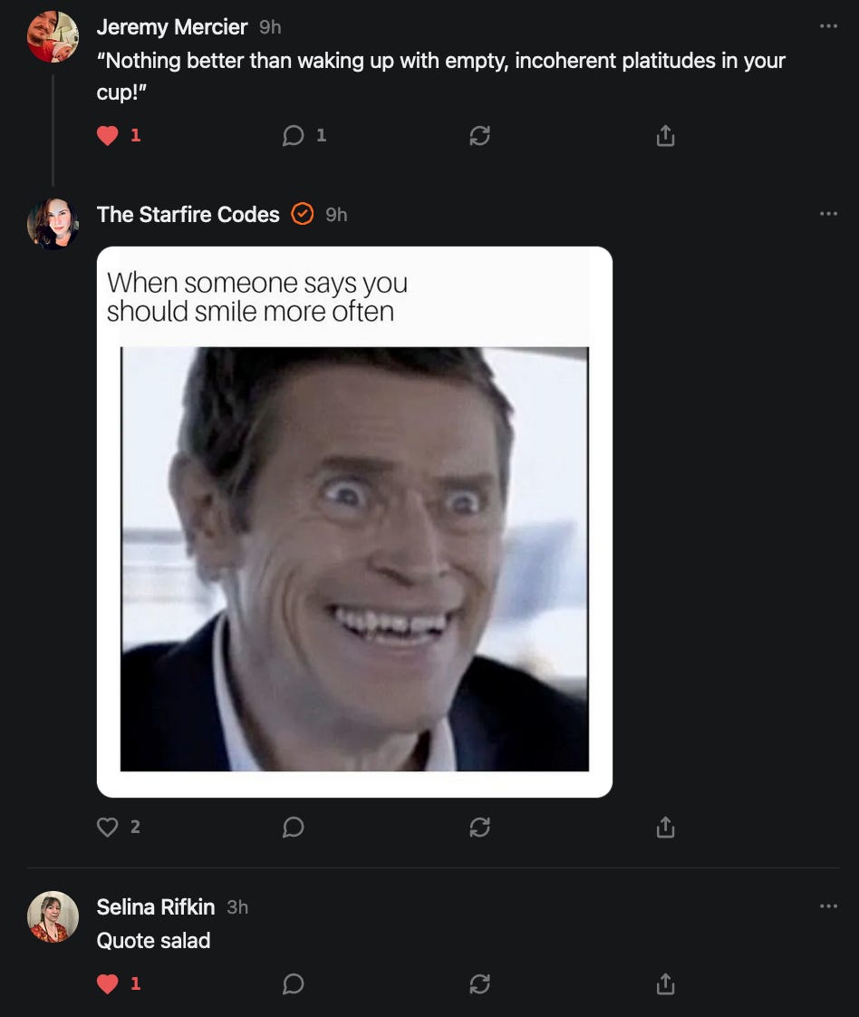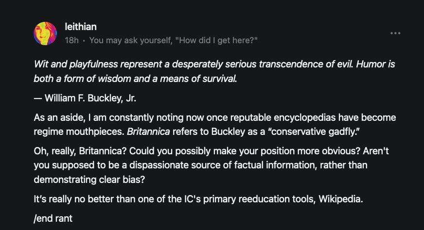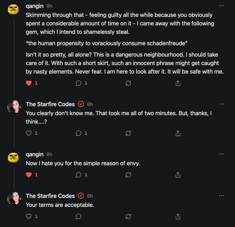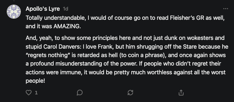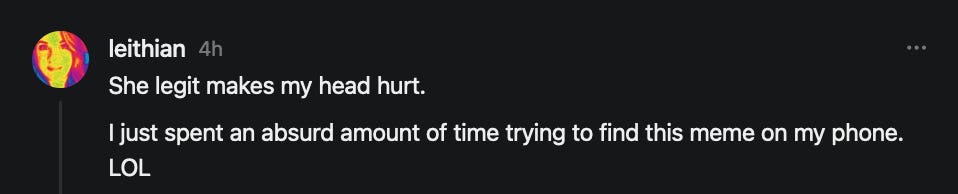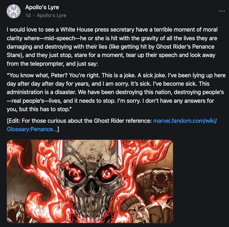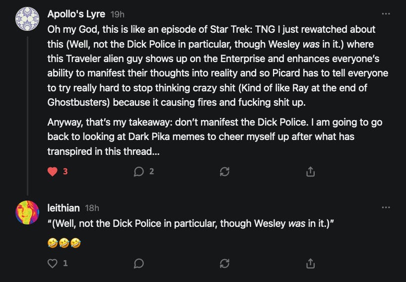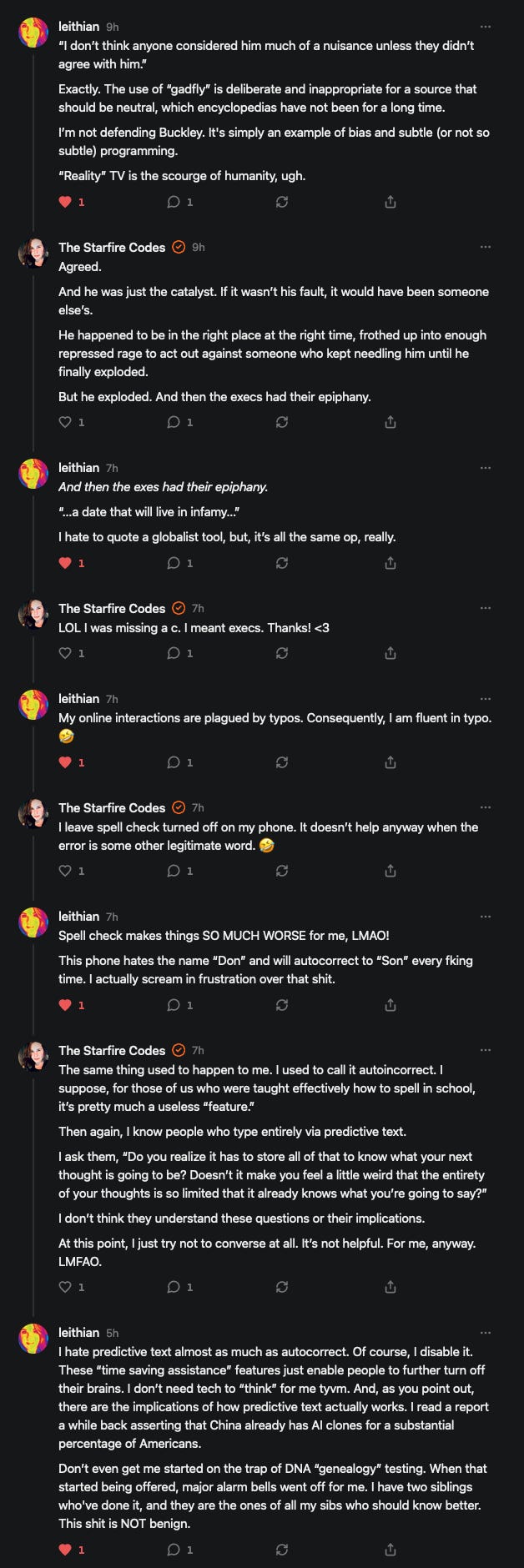 So, while I can parse that out, taking only the information I need and leaving the psychosis behind, I can’t repost any of it without feeling like I’m at odds with it ethically, specifically because I don’t want to spread psychotic ideas just because I want others to look at the potentially useful ones and have the discernment to discard the psychotic ones.