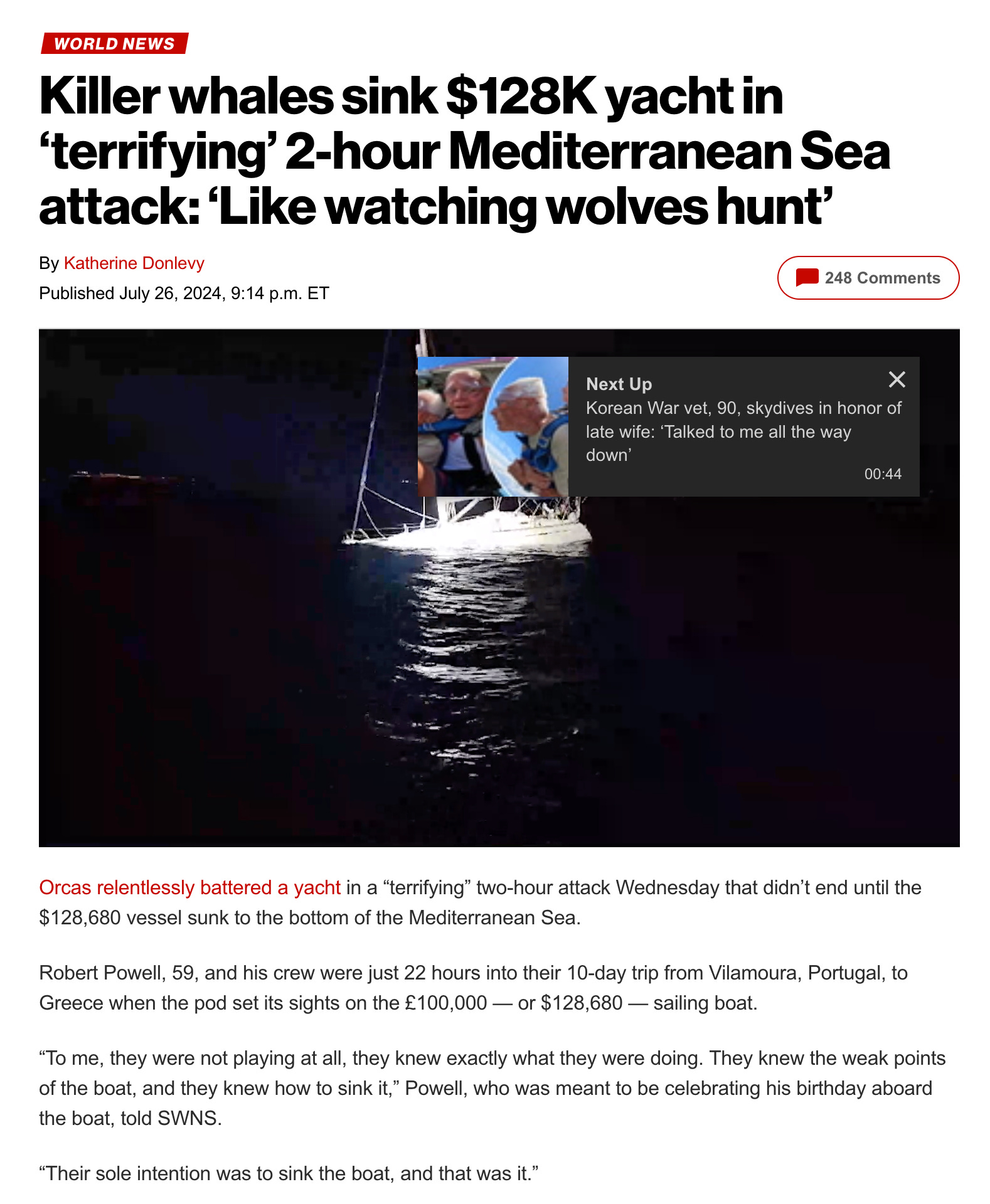 :Donlevy, K. (2024). Killer whales sink $128K yacht in ‘terrifying’ 2-hour Mediterranean Sea attack: ‘Like watching wolves hunt.’ New York Post.