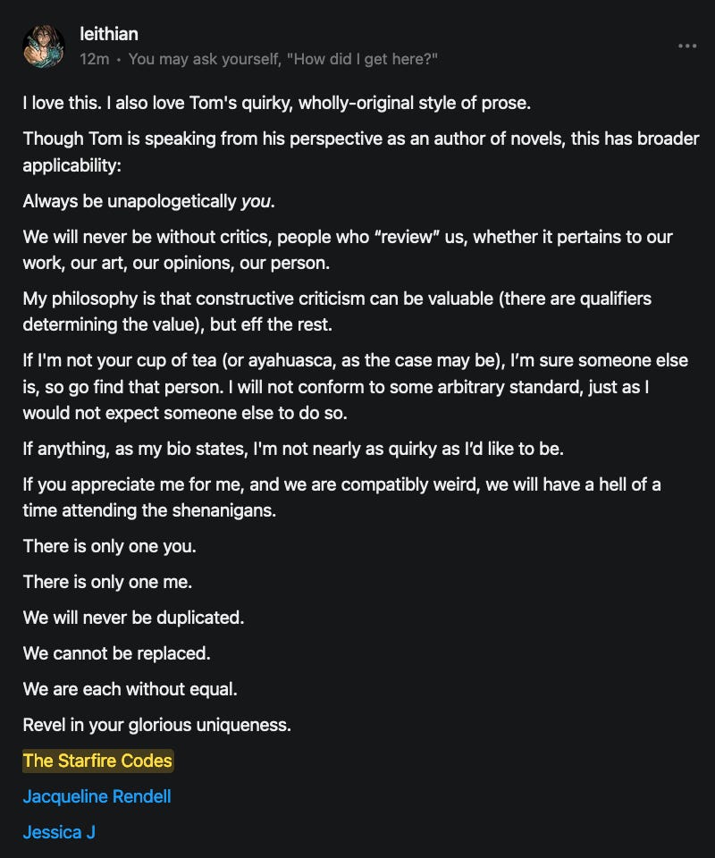 Conversely, when they see something they like, they glom onto it with a deep emotional fervor that turns the person relaying the information into a guru or the ideology they have imparted into their latest -ism that they want so desperately to leg-hump to death, even if, as is the case with Land, they don’t see the forest for the trees enough to understand that the guy literally wants humanity to die. And I want to stay as far away from that kind of blind guru and ideology worshiping behavior as humanly possible. But that’s how most people are. Conundrum.