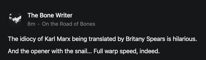 Speaking of missing the joke, I’m reading the CCRU literature, but let’s be clear that I am doing so in the same way that I would read through Crowley to uncover metaphysical technology, in a sense. It’s not because I have some affinity for Crowley. Crowley was a nutcase.