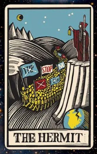 I’m not accustomed to Tarot readings and may be totally off, but is it possible that the hermit here represents an ostensible “outsider”, meaning someone who is claiming to have been out in the wilderness and who has obtained hidden knowledge? But in this case the supposed outsider is actually just another instrument of the powerful, as he is just directing the masses (as Starfire says) like the pied piper? Calls to mind any number of theoretically ‘alternative’ media figures people follow who are actually instruments of the powerful..