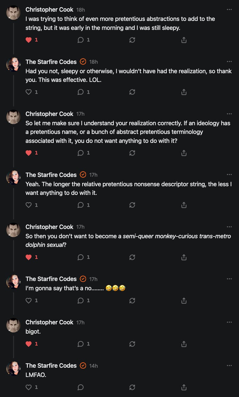 Conversely, when they see something they like, they glom onto it with a deep emotional fervor that turns the person relaying the information into a guru or the ideology they have imparted into their latest -ism that they want so desperately to leg-hump to death, even if, as is the case with Land, they don’t see the forest for the trees enough to understand that the guy literally wants humanity to die. And I want to stay as far away from that kind of blind guru and ideology worshiping behavior as humanly possible. But that’s how most people are. Conundrum.