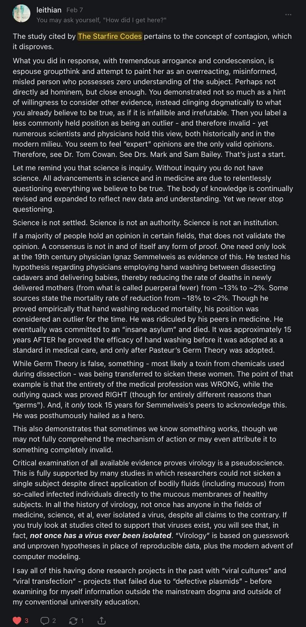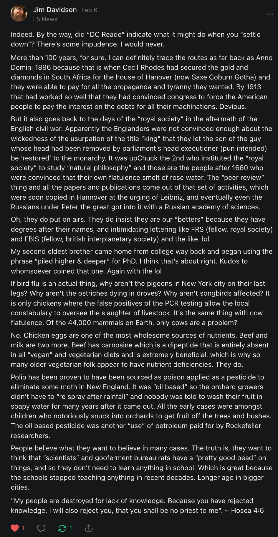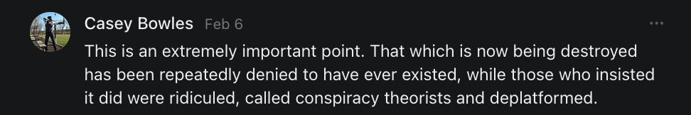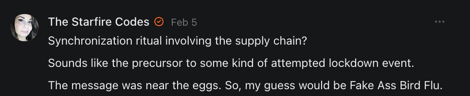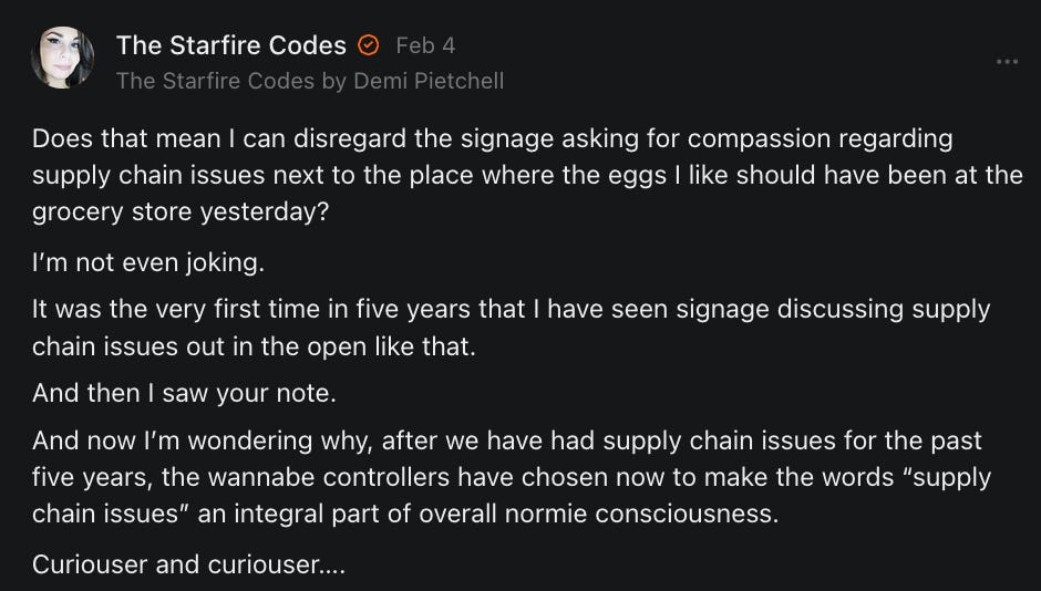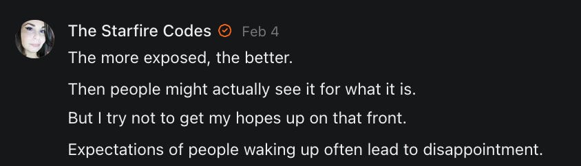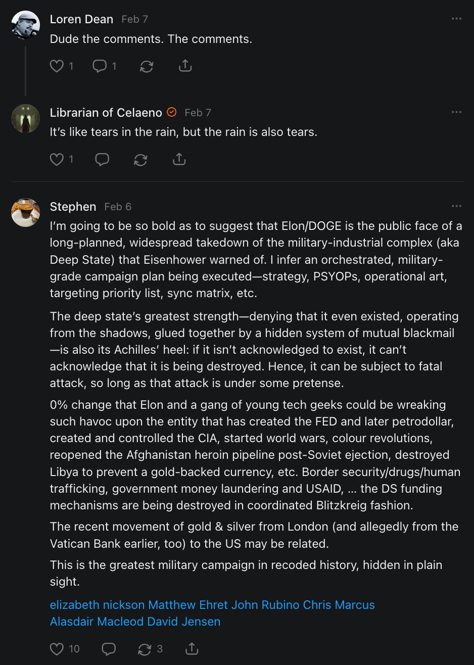 Special thanks to Michael Newberry, Switter’s World, Tracy, Blessed Warrior Reina, Sasha V, valerio, American Nobody, Nani Lani, Karen LeBlanc, Asperges, Rat, Ken Macko, Buggs, Moms Justice Alerts, Johanna Polus, Bobby Schlueter, qangin, Roger, Cameron M. Bailey, The Contrarian Capitalist, Flea Mason, Nathalie Martinek PhD, IPR with Mack Morris, Austin Muhs, Charlotte Pendragon, PhilanthroPissed, E. Jackson, - Rothi I S I P U -, Kent Peterson, Apollo's Lyre, mg, Boflys, Amber Block, TJ, Jeff, Atomic Statements, Becky N., smellycarney, Laggy, Austin Caroe, The Underdog, MJNAVET, Kenneth R. Mintz, the long warred, Philip M. Smith/“Big Philly”, Lex Rex, Esq., Julie, Gary E., MRT’s Haircut, Koltin Scott, Andrew White, Rascal Nick Of, Jim, Anomalous Farrier, Librarian of Celaeno, Love, IPR with Mack Morris, Vance Gatlin, William Hunter Duncan, i3utm, Barbara, Brett A Dill, HamburgerToday, Sandra Combs, Christy Hardin, Doctor Kitt, Joseph Hex, An K., A Citizen, Demonhype, Miss Information, Alfred, Lord Featherstonehaugh, Shanti Rae Lobaugh, Bill, Lia, 2aAlltheWay, Constance, Greg Nance, Xingyi, Chris Falk, Myriad Mike, Stratum Press, Michael Smith, Jake Purvis, Simon Tanner, Jeff Melody, Adrian, Jules, Nels Cutchall, Bart Bounds, Gregory Woods, Teresa Thibodeaux, Debra Szalay, Villein Villion, Erick, Duane, christopher cheatham, Chef Sherry, Norm, Lisa Nicholson, AllAboutEve43, Richard Blackwell, jennifer dibley, Fallon Clark, Andrew | Dad Explains, 13/1 NYS CONstitution, Mike Moschos, Brion PK, Frater Seamus, Kevin Fredericks, Rene Jax, 2aAlltheWay, Dear Citizen, Robert C Culwell, Grand Mal Twerkin, Karina Pawlak, Mike Lara, Jeff McConnell, Jacquelyn Gill, Wolf Krauß, werner aquadea, Susan Taapken, Grand Schemes, Cori Bren, Darian Δ, the author, Jean Marie Bauhaus, Thea, RECrowley, Lin, goodnightrose, Travis Neville Author, splendidretainer, In Love with a Dead Man, Braeden Mitchell, Darrin, Alison Bull, Duane, Stephane J. Perrin, The Mighty Humanzee, Nathalie Martinek PhD, ThothStudio (JCofMars), Robert Peter Kearns, Dan, David Buffalo, Adrian, Jules, Z. Hajime Sertorius, James Logan, AJ, Jackieone, Dana Morehouse, i3utm, Commander Nelson, Warthog, Percival Blakeney, Redbonebandit, Bill Price, Andrew White, Jeffrey Pikul, Sean, DC Reade, tru3, James Love-Vani, Julie, Lucy, Belisa Santiago, Erin Masada, Christopher Cook, The Brothers Krynn, Josh Slocum, Angela Morris, April Novoa, Terrence Gideon, nobody, Bill Pieper, Michael Dreyer, Atomic Statements, Maggie, Deborah Witte, Jeff Melody, The FOJ 449331, Guy Ewing, Promise Workshop, Fritz, Simon Tanner, Andrew Bagley, Courtney, Louis Mettey, Chris commins, Dee Rambeau, Wes Iddings, Jean-Marc, Jim J Wilsky, Deborah T. Hewitt, Frances Leader, Stone Bryson, Morgthorak the Undead, Barbara Wegner, Julian Ajello, Flea Mason, Ol' Doc Skepsis, Allison Riney, leithian, Leslie Fuquinay Miller, The Otter, Jim Davidson, Shannon O’Neill, Dave pearen, Jacqueline Rendell, Char, HamburgerToday, Fritz, Joyce, Stephen, Michael Vigne, ric leczel, the bast, William Hunter Duncan, Remanon Last, Miriam Rachel, The Ivy Exile, Zach Frey, Mike Kay, Renee Green, Sara Stibitz, Lord Skei, Teàrlach, Angel, Shanti Rae Lobaugh, Agent 1-4-9, Lukeas, Mojo Woo, Mia Groves, ShotTheBreeze, Nina Barufaldi, Simon Tanner, Jenean McBrearty, Joseph W. Knowles, Tim Ebl, Geraldine A. V. Hughes, Lilly, Merlin Marquardt, Tara Perrot, Samuel Hanok, Geoff Campbell, Grant Schaeffer, Marisa Baggett, Sevon Coe, xena upside, Matt Monster, No Use For a Name, Dana Morehouse, Linda, Melody Rose, Nancye, Monica's Dark Corner, Anna Marie, Valiarnt Fydar, Becky, Van Ivey, Tish Rezek, Dana, Aime 1030, Stephanie Koopmans, Wheel of Ezekiel Astrology, Joel Walbert, J.T.W., Geno Merryman, Dav Eka, Kenneth R. Mintz, Esborogardius Antoniopolus, Alan Devincentis, Louis Noble, Sergei Ravinovich, Shirlee, Based in Paris, Arrr Bee, V900, Penny Adrian, 9A, The Ivy Exile, AnimalSpirits, UnLambed Zoomer, Fukitol, PxD, Frank, BookWench, Micah Paul Veillon, Dash Dobrofsky, Russell Wilson, Qtto, Elizabeth Hamilton, Durling Heath, David Stark, CR, Geary Johansen, Rebecca, Sheila Dean, Ken Barber, Desmondffarrelly@icloud.com, Kerry Jane, Chris Hall, Professor Axelrod, Last Redoubt, Geoff Campbell, The Brothers Krynn, Gilbo Raggins, David Jensen, Alasdair Macleod, Chris Marcus, John Rubino, Matthew Ehret, elizabeth nickson, Stephen, Loren Dean, Casey Bowles, R.B. Lamb, JasonT, Cody Walker, Kalihi Valley Druid, Peregrinus, Ali Lynn, PSW, CernelJoson, Bryce E. 'Esquire' Rasmussen, Uncouth Barbarian, Rod Dreher, Doug204, Margaritas at the Mall, Shawn Truax, Dean, The Black Knight, and swiley for inspiring these responses and contributing to the subsequent posts and conversations. And thank you to everyone else who contributed to these conversations! 🙏🏻💜💫