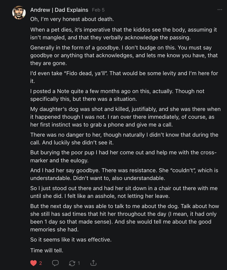 This is coming from someone whose family utterly failed at this task. I laugh about it now, but at the time, it was thoroughly obnoxious. We moved away from my grandmother and her dog, the dog I grew up with, and he died. Instead of telling me the dog died, they engineered an elaborate five-year ruse in which, each time I visited, the dog was “at the vet.”