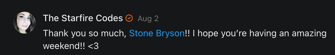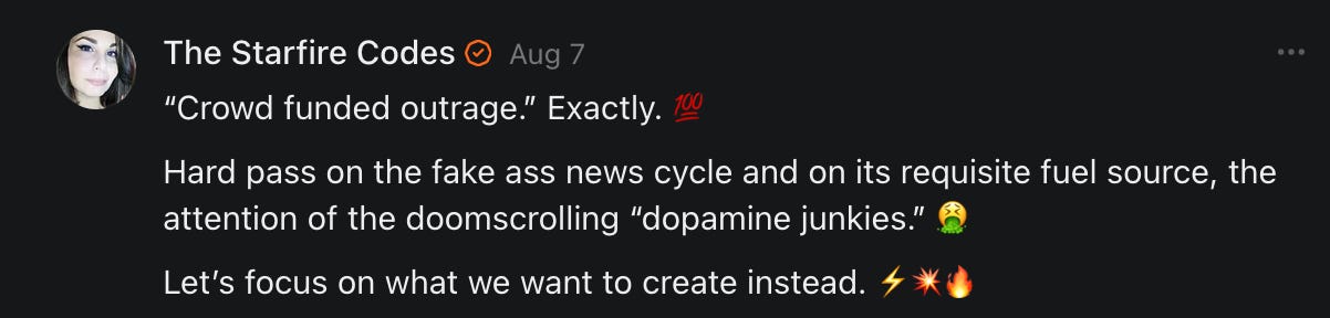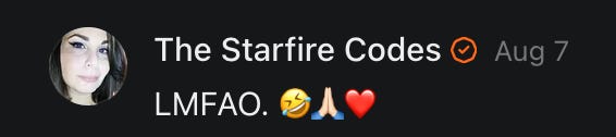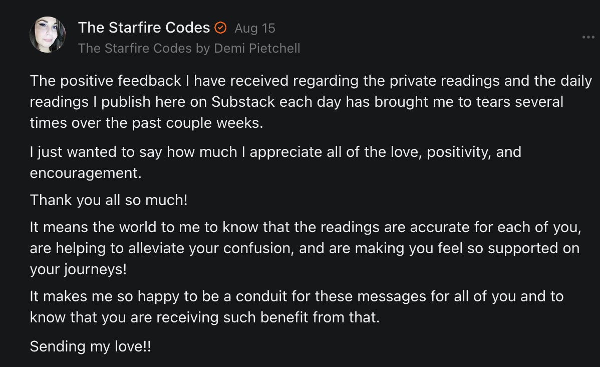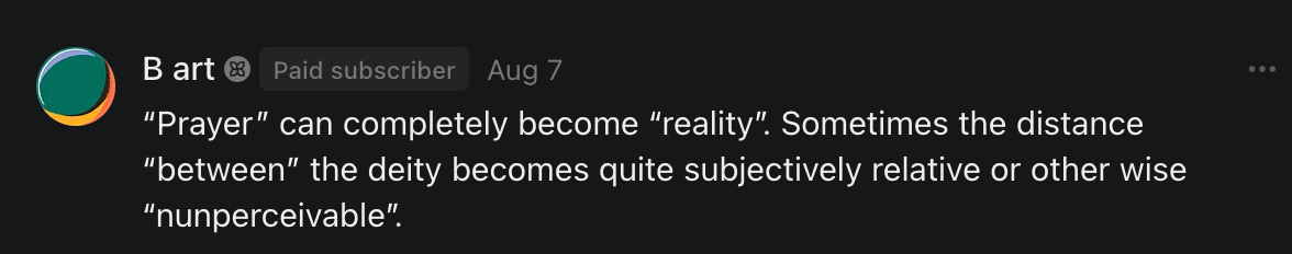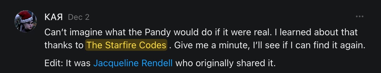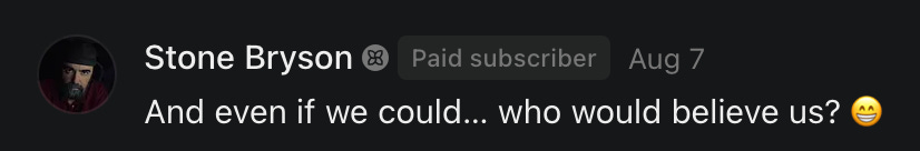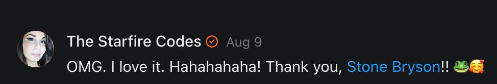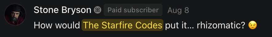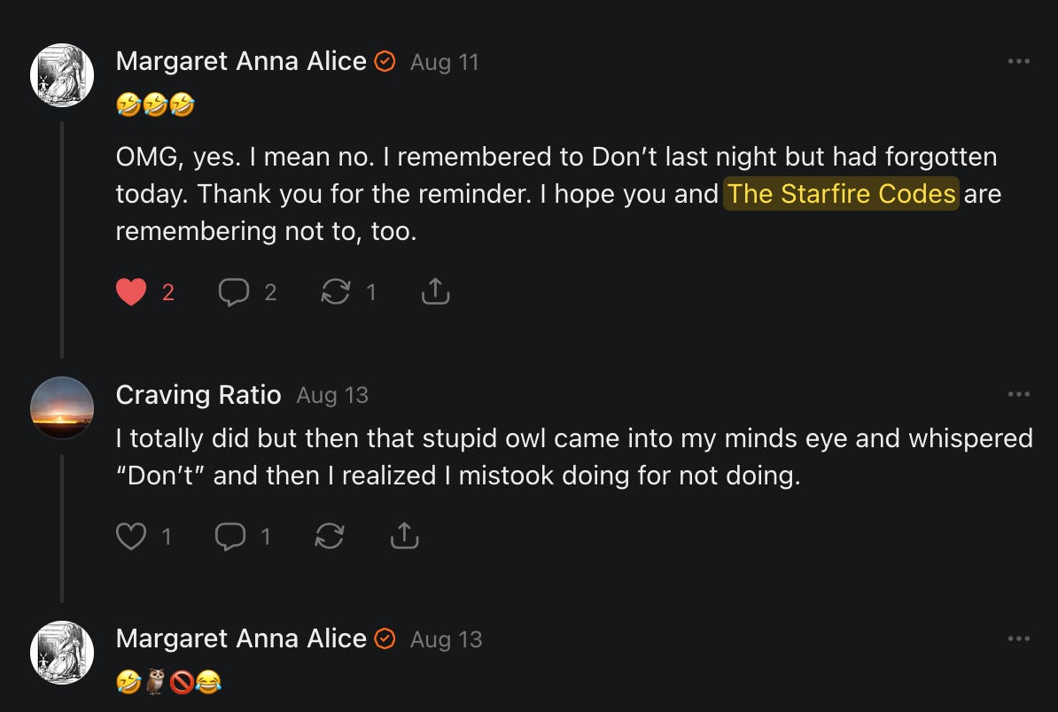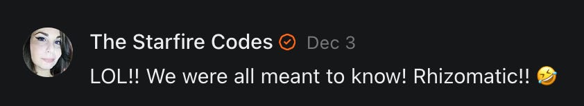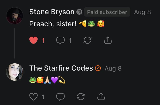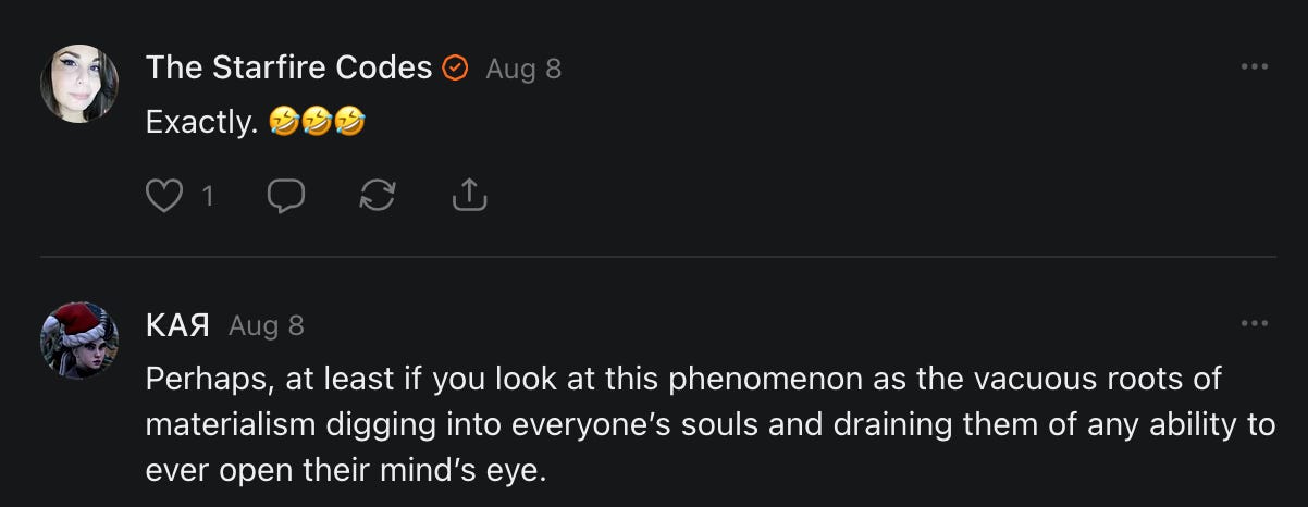 Special thanks to S.E. Reid, John Lovie, Shane Hardwick, Nick Winney, džič, Ryan Kunz, Lore Wilbert, NJ Simat 🤍, Fun & Dandy, Scoot, Stephanie Loomis, Tell Me a Mystery, Wayne Johnson, Jon Lort, Michael Persin, Matt Payne, RML, Switter’s World, Maryellen Brady 💗📚, Maximilian Siddell, Evan Miller, Shell, Jon Sparks, David Perlmutter, It's Hell, Actually, Ian Barr, Bridget Riley, КАЯ, Haly, the Moonlight Bard ✒️, L.C. Marino, HaLingoGringo, mike vague, Remus Noronha, Sean Nordquist, Kummer Wolfe, Nimita Kaul, Leroy Jenkins, christopher sexton, TheLastBattleStation, Barbara Graver, Liz Zimmers, Hero Duchesne, Logan Ashe Darrow, Cheese lady, Robert R. Fike, Kit Russell, DIANA ADMIRE, Lisa Korytowski, Jeremy Spool, Jim Davidson, Bart Bounds, Dear Citizen, overflowing ashtray, Linda Slow Growing in Scotland, Hal Gill, Fallon Clark, Jenn Zuko, Keena, Mairi Bontorno, Ray Foy, Travis Christian Lau, Love, Mike Kay, leithian, Joyce, Librarian of Celaeno, William Hunter Duncan, Michael Newberry, Dave pearen, Betty Boldbrew, Tara Deacon, Britnee Wild, Cara Slahtovsky, Alfred, Lord Featherstonehaugh, Stone Bryson, Anne West, 𝓡𝓪𝓺𝓾𝓮𝓵 𝓕 ⟢, Cameron M. Bailey, WouldHeBearIt, Jeremy Mercier, tru3, Joe Bulls, Bee_ing, Amy Sukwan, Snunya B. Inniss, 𝕃𝕒𝕥𝕖𝕣𝕒𝕝 𝕋𝕨𝕚𝕥𝕝𝕖𝕣®™, Kelila, Roger Edwards, Angel, jh, ThothStudio (JCofMars), Jack Everly, Marc André, Tom Calabretta, Andrew | Dad Explains, Zach Frey, The Brothers Krynn, Christopher Cook, Shanti Rae Lobaugh, An K., Antila H. Belist, Fireman1110, Matthew Thompson, Michael Arturo, Greg Nance, Mark R Johnson, MrEscher, Shoshana Ray, Venus, OGRE, Moth, SEMIVISION, The New Unhinged, Dana, Chris Best, Jeremy Pinnix, Matt Swider, Isaac Orr, Dakara, Ashish Kulkarni, Jeffrey Pikul, Chris Tottman, Donatela Bellone, Craig, Enon, Marc Baumann, Ruben Dominguez, Adam M. Adamek, PhD, Adam Metz, Don, {R}OGUE, Meg, Jenifer Jorgenson, Margaret Anna Alice, Swiss Transparent Portfolio, Casey R, Jeremy Camilloni, Yannis | DeFi insights, Sandra, FranieBGroovy, Trine Lovell, Contrarian Investor Media, Amy Mitchell, Richard Jannaccio, Sue Cawthorne, Paraskevi Kivroglou, Substack Team, Casandra Campbell, Ollie Forsyth, Sid Saladi, Jason Wojcik, Federico Francia, Substack, Savant in Space, Jenny Ouyang, Paweł Huryn, Kush Patel, Joshua Conner, Craving Ratio, Nathan Buff, scott m, Ken Macko, Rebecca, Jeff McConnell 🏴☠️⚔️🏴, Elliott, Eric Brown, Shawn Truax, Marinarena, Scott, Asperges, CS Norton, Ploxxii, Monty Speaks, Tim Ebl 🇨🇦, Dr. Marizelle | Undiagnosed, KMPatriot, VJ Brion, Eduardo de Leon, Cheramie III%, Erik Hogan, maryh10000, Rick, Dudge.OH, The Man Behind the Screen, MRT’s Haircut, Panama Dusa, Dave, Silent Siren, Katie Barbaro, Miss Information, Nathalie Martinek PhD, Little Gray, Kristy, Michele Wetuski, Allie Whitts, Marco Brunet, TC Marti, Grace Asharah, Philip “Big Philly” Smith, Steve Holliday, Country Wild Child, Donn Harper Jr., Kalihi Valley Druid, Jessica Garcia, Blake from WTF Over, Greg Pennell, Phillip A. Ross, Jacqueline Rendell, Tom, Shannon, Liz LaSorte, Chris Reid, The Ivy Exile, Cori Bren, Silver Bear, Ryven, Andrew White, matt Arnold, wayne john, Barbara Parker, Marion Lewis, John K III, Angela Morris, Harrison, Secret History Of The World, B art, Dante, Ktbriola, L. E. Mullin, Alice Berlow, Kelly Thompson TNWWY, Clear Skies 421, Christy Hardin, Indie, Sunshine, Paul Wittenberger, Warren Baxter, Wayne Mathias, Chelsea Hill, Shay Baxter, Bruno Rothgiesser, Nathan Carney, Victory Palace, Shelley, Silver Warrior, Will Smith, Michelle, Rose Sybil, Georgina Bruce, Anyeri, Daisy Watson, marilyn anthony, constellation chats, John Inubook, Judy, Brian Henderson, 1.032547698, Mr.Buggs, Red Barchetta, Brad Davenport, Holly Rock, Matt Price, Dawn Bernard, Vicki R, Karen LeBlanc, Barbara, AJR, Called Homeward, F. Jeremiah Chamberlain, Kenneth E. Harrell, Nancy Rusk, Z. Hajime Sertorius, Melinda D., Colin Elliott, R. H. Snow, Jackieone, SpandX, Cosmic Sushi, Kathrine Elaine, Corinne, Katy Marriott, The Bone Writer, Char, Frances Burger, Author John G. Dyer, Nick Neve, Sarah Posthuma, Cdogg, George P Farrell, Matt likes to do things., 2aAlltheWay, Kerry, Kevin Nash, The Poetry Witch 🥀, Redneck Robespierre, Travis Christian Lau, Soulma Star, Lightning Strikes Twice, Cluis, Michael DiBaggio, Gerry Hibbs, Kristy Hopkins, Konstanze, Natalia Beme, Recess Hall of Famer, Renee Green, Elizabeth Chaykowski, 🎧rcus Auditory, The Elder of Vicksburg, Da Hughes, Trudi Nicola, Adrienne, Roo’s Views, an enchantress, GeorgeTirebiter53, Philip Ferrar, Kobalevsky 42, Goddess Renell, Psychic Medium, Donna Frasca, Mark McGrath | OODA Strategist, Dynamic DV, Ngozi Janea, Rebecca Kueny, Blessed Warrior Reina, Belinda Fettke, radicaledward, Lia, Morgan OCailleigh, Lulu Pearl Trevena, Sophie Morgan Burns, joanneviolet, Valkyrie, Tom Cox, Cara West 🐉✨ Guide Of Dragons, Destiny Castaneda, BlackOrchid, glenn, Hooray Ash, Jason Chastain, Rat, Apollo's Lyre, Erin J. Morgart, April Novoa, Anthony Bevilacqua, Matangi, AllAboutEve43, Mike, IPR with Mack Morris, Michael Henry Dunn, Cheryl Turner, Karina Schneidman MBA, MS, Derek T, Shaunak Agarkhedkar, Alex de Carvalho, Stjarna, Ishmael Wallace, The Universe, The Corbett Report, Howard Bloom, Erin Pinson, Brian “Ponch” Rivera, VioletFemme1, Conspiracy Sarah, and Benjamin Sharp for inspiring these responses and contributing to the subsequent posts and conversations. And thank you to everyone else who contributed to these conversations! 🙏🏻💜💫