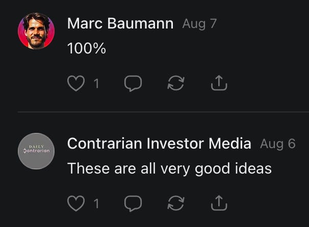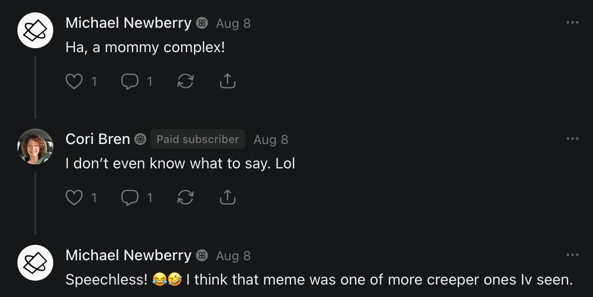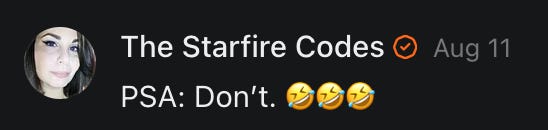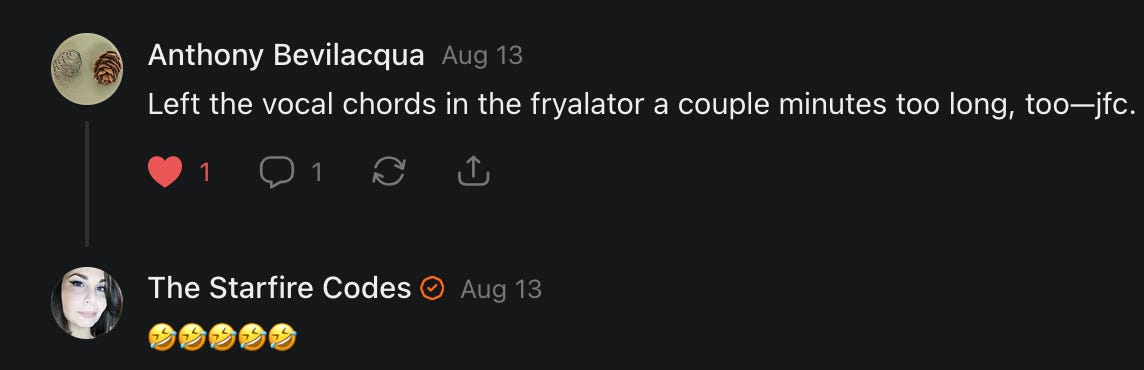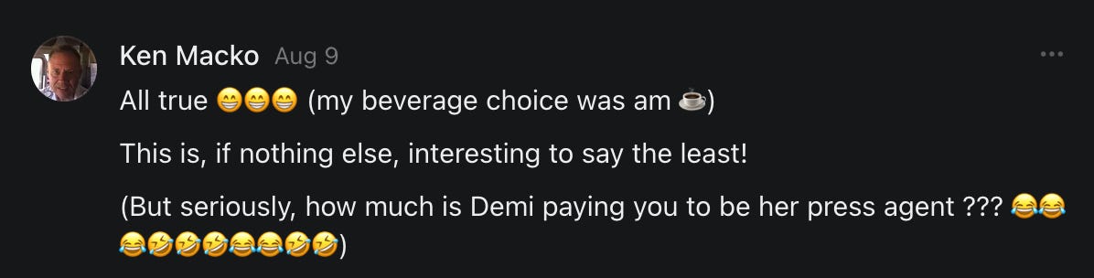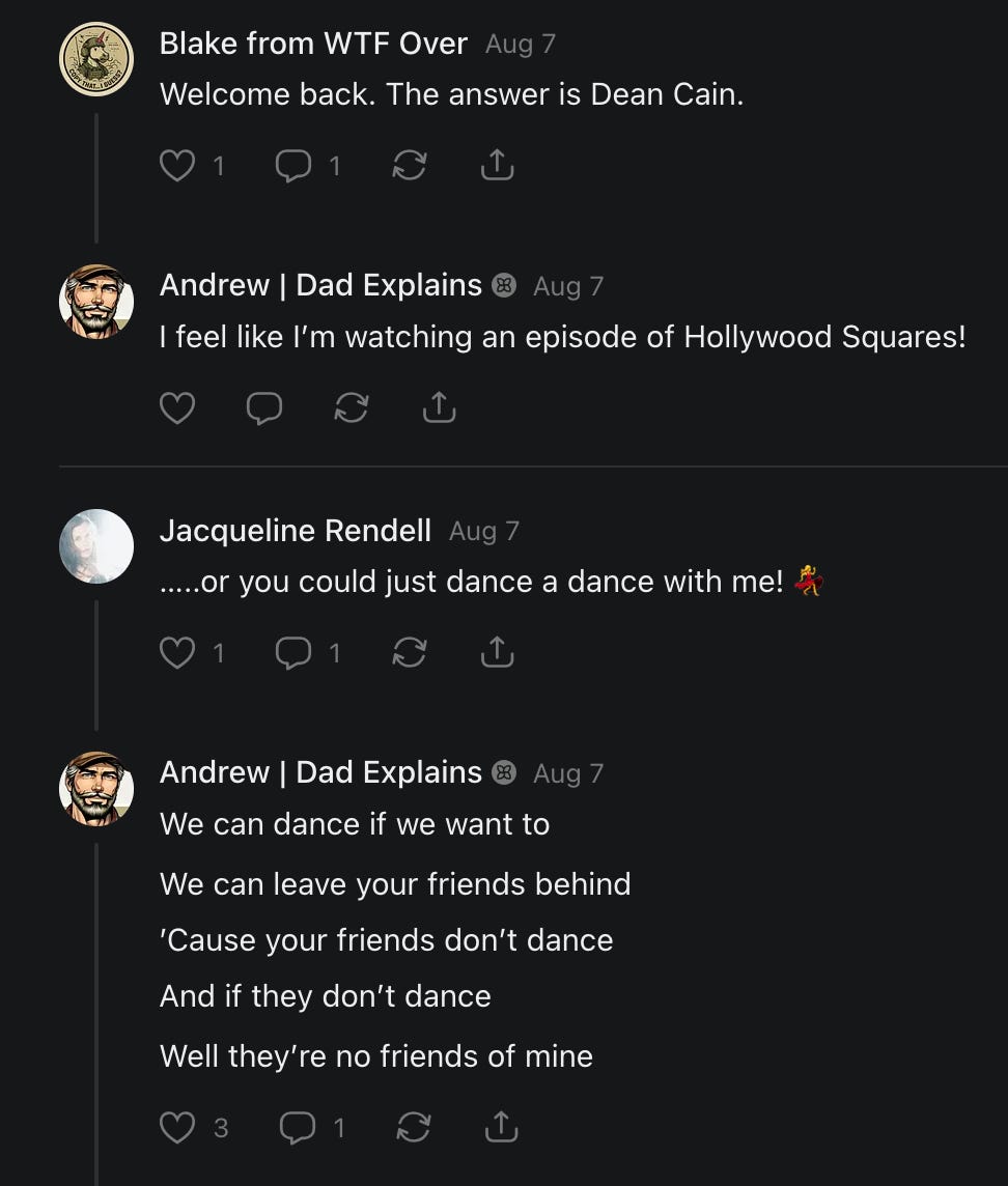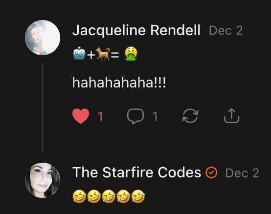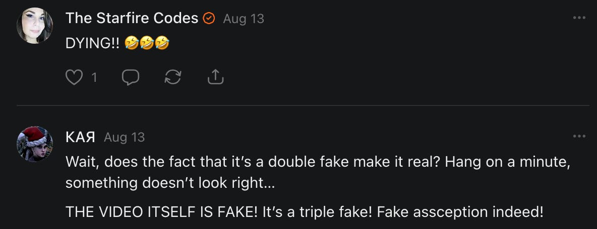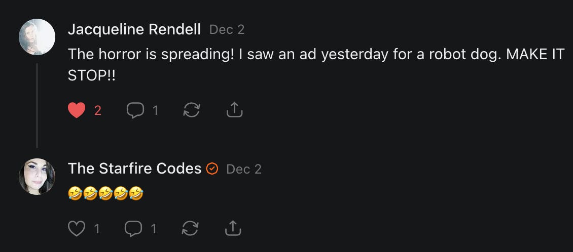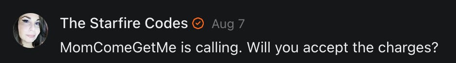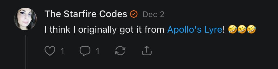 Special thanks to S.E. Reid, John Lovie, Shane Hardwick, Nick Winney, džič, Ryan Kunz, Lore Wilbert, NJ Simat 🤍, Fun & Dandy, Scoot, Stephanie Loomis, Tell Me a Mystery, Wayne Johnson, Jon Lort, Michael Persin, Matt Payne, RML, Switter’s World, Maryellen Brady 💗📚, Maximilian Siddell, Evan Miller, Shell, Jon Sparks, David Perlmutter, It's Hell, Actually, Ian Barr, Bridget Riley, КАЯ, Haly, the Moonlight Bard ✒️, L.C. Marino, HaLingoGringo, mike vague, Remus Noronha, Sean Nordquist, Kummer Wolfe, Nimita Kaul, Leroy Jenkins, christopher sexton, TheLastBattleStation, Barbara Graver, Liz Zimmers, Hero Duchesne, Logan Ashe Darrow, Cheese lady, Robert R. Fike, Kit Russell, DIANA ADMIRE, Lisa Korytowski, Jeremy Spool, Jim Davidson, Bart Bounds, Dear Citizen, overflowing ashtray, Linda Slow Growing in Scotland, Hal Gill, Fallon Clark, Jenn Zuko, Keena, Mairi Bontorno, Ray Foy, Travis Christian Lau, Love, Mike Kay, leithian, Joyce, Librarian of Celaeno, William Hunter Duncan, Michael Newberry, Dave pearen, Betty Boldbrew, Tara Deacon, Britnee Wild, Cara Slahtovsky, Alfred, Lord Featherstonehaugh, Stone Bryson, Anne West, 𝓡𝓪𝓺𝓾𝓮𝓵 𝓕 ⟢, Cameron M. Bailey, WouldHeBearIt, Jeremy Mercier, tru3, Joe Bulls, Bee_ing, Amy Sukwan, Snunya B. Inniss, 𝕃𝕒𝕥𝕖𝕣𝕒𝕝 𝕋𝕨𝕚𝕥𝕝𝕖𝕣®™, Kelila, Roger Edwards, Angel, jh, ThothStudio (JCofMars), Jack Everly, Marc André, Tom Calabretta, Andrew | Dad Explains, Zach Frey, The Brothers Krynn, Christopher Cook, Shanti Rae Lobaugh, An K., Antila H. Belist, Fireman1110, Matthew Thompson, Michael Arturo, Greg Nance, Mark R Johnson, MrEscher, Shoshana Ray, Venus, OGRE, Moth, SEMIVISION, The New Unhinged, Dana, Chris Best, Jeremy Pinnix, Matt Swider, Isaac Orr, Dakara, Ashish Kulkarni, Jeffrey Pikul, Chris Tottman, Donatela Bellone, Craig, Enon, Marc Baumann, Ruben Dominguez, Adam M. Adamek, PhD, Adam Metz, Don, {R}OGUE, Meg, Jenifer Jorgenson, Margaret Anna Alice, Swiss Transparent Portfolio, Casey R, Jeremy Camilloni, Yannis | DeFi insights, Sandra, FranieBGroovy, Trine Lovell, Contrarian Investor Media, Amy Mitchell, Richard Jannaccio, Sue Cawthorne, Paraskevi Kivroglou, Substack Team, Casandra Campbell, Ollie Forsyth, Sid Saladi, Jason Wojcik, Federico Francia, Substack, Savant in Space, Jenny Ouyang, Paweł Huryn, Kush Patel, Joshua Conner, Craving Ratio, Nathan Buff, scott m, Ken Macko, Rebecca, Jeff McConnell 🏴☠️⚔️🏴, Elliott, Eric Brown, Shawn Truax, Marinarena, Scott, Asperges, CS Norton, Ploxxii, Monty Speaks, Tim Ebl 🇨🇦, Dr. Marizelle | Undiagnosed, KMPatriot, VJ Brion, Eduardo de Leon, Cheramie III%, Erik Hogan, maryh10000, Rick, Dudge.OH, The Man Behind the Screen, MRT’s Haircut, Panama Dusa, Dave, Silent Siren, Katie Barbaro, Miss Information, Nathalie Martinek PhD, Little Gray, Kristy, Michele Wetuski, Allie Whitts, Marco Brunet, TC Marti, Grace Asharah, Philip “Big Philly” Smith, Steve Holliday, Country Wild Child, Donn Harper Jr., Kalihi Valley Druid, Jessica Garcia, Blake from WTF Over, Greg Pennell, Phillip A. Ross, Jacqueline Rendell, Tom, Shannon, Liz LaSorte, Chris Reid, The Ivy Exile, Cori Bren, Silver Bear, Ryven, Andrew White, matt Arnold, wayne john, Barbara Parker, Marion Lewis, John K III, Angela Morris, Harrison, Secret History Of The World, B art, Dante, Ktbriola, L. E. Mullin, Alice Berlow, Kelly Thompson TNWWY, Clear Skies 421, Christy Hardin, Indie, Sunshine, Paul Wittenberger, Warren Baxter, Wayne Mathias, Chelsea Hill, Shay Baxter, Bruno Rothgiesser, Nathan Carney, Victory Palace, Shelley, Silver Warrior, Will Smith, Michelle, Rose Sybil, Georgina Bruce, Anyeri, Daisy Watson, marilyn anthony, constellation chats, John Inubook, Judy, Brian Henderson, 1.032547698, Mr.Buggs, Red Barchetta, Brad Davenport, Holly Rock, Matt Price, Dawn Bernard, Vicki R, Karen LeBlanc, Barbara, AJR, Called Homeward, F. Jeremiah Chamberlain, Kenneth E. Harrell, Nancy Rusk, Z. Hajime Sertorius, Melinda D., Colin Elliott, R. H. Snow, Jackieone, SpandX, Cosmic Sushi, Kathrine Elaine, Corinne, Katy Marriott, The Bone Writer, Char, Frances Burger, Author John G. Dyer, Nick Neve, Sarah Posthuma, Cdogg, George P Farrell, Matt likes to do things., 2aAlltheWay, Kerry, Kevin Nash, The Poetry Witch 🥀, Redneck Robespierre, Travis Christian Lau, Soulma Star, Lightning Strikes Twice, Cluis, Michael DiBaggio, Gerry Hibbs, Kristy Hopkins, Konstanze, Natalia Beme, Recess Hall of Famer, Renee Green, Elizabeth Chaykowski, 🎧rcus Auditory, The Elder of Vicksburg, Da Hughes, Trudi Nicola, Adrienne, Roo’s Views, an enchantress, GeorgeTirebiter53, Philip Ferrar, Kobalevsky 42, Goddess Renell, Psychic Medium, Donna Frasca, Mark McGrath | OODA Strategist, Dynamic DV, Ngozi Janea, Rebecca Kueny, Blessed Warrior Reina, Belinda Fettke, radicaledward, Lia, Morgan OCailleigh, Lulu Pearl Trevena, Sophie Morgan Burns, joanneviolet, Valkyrie, Tom Cox, Cara West 🐉✨ Guide Of Dragons, Destiny Castaneda, BlackOrchid, glenn, Hooray Ash, Jason Chastain, Rat, Apollo's Lyre, Erin J. Morgart, April Novoa, Anthony Bevilacqua, Matangi, AllAboutEve43, Mike, IPR with Mack Morris, Michael Henry Dunn, Cheryl Turner, Karina Schneidman MBA, MS, Derek T, Shaunak Agarkhedkar, Alex de Carvalho, Stjarna, Ishmael Wallace, The Universe, The Corbett Report, Howard Bloom, Erin Pinson, Brian “Ponch” Rivera, VioletFemme1, Conspiracy Sarah, and Benjamin Sharp for inspiring these responses and contributing to the subsequent posts and conversations. And thank you to everyone else who contributed to these conversations! 🙏🏻💜💫