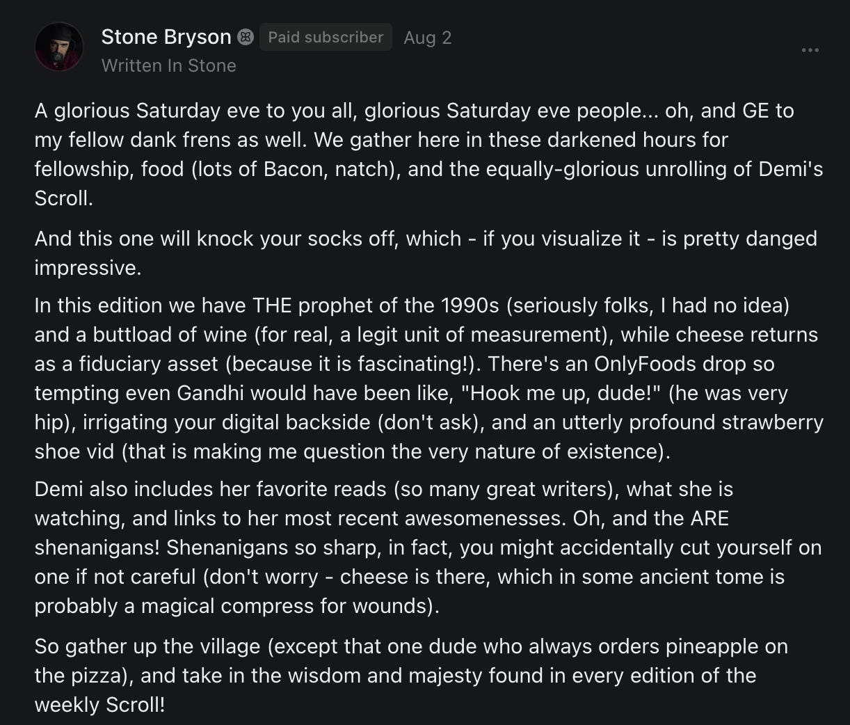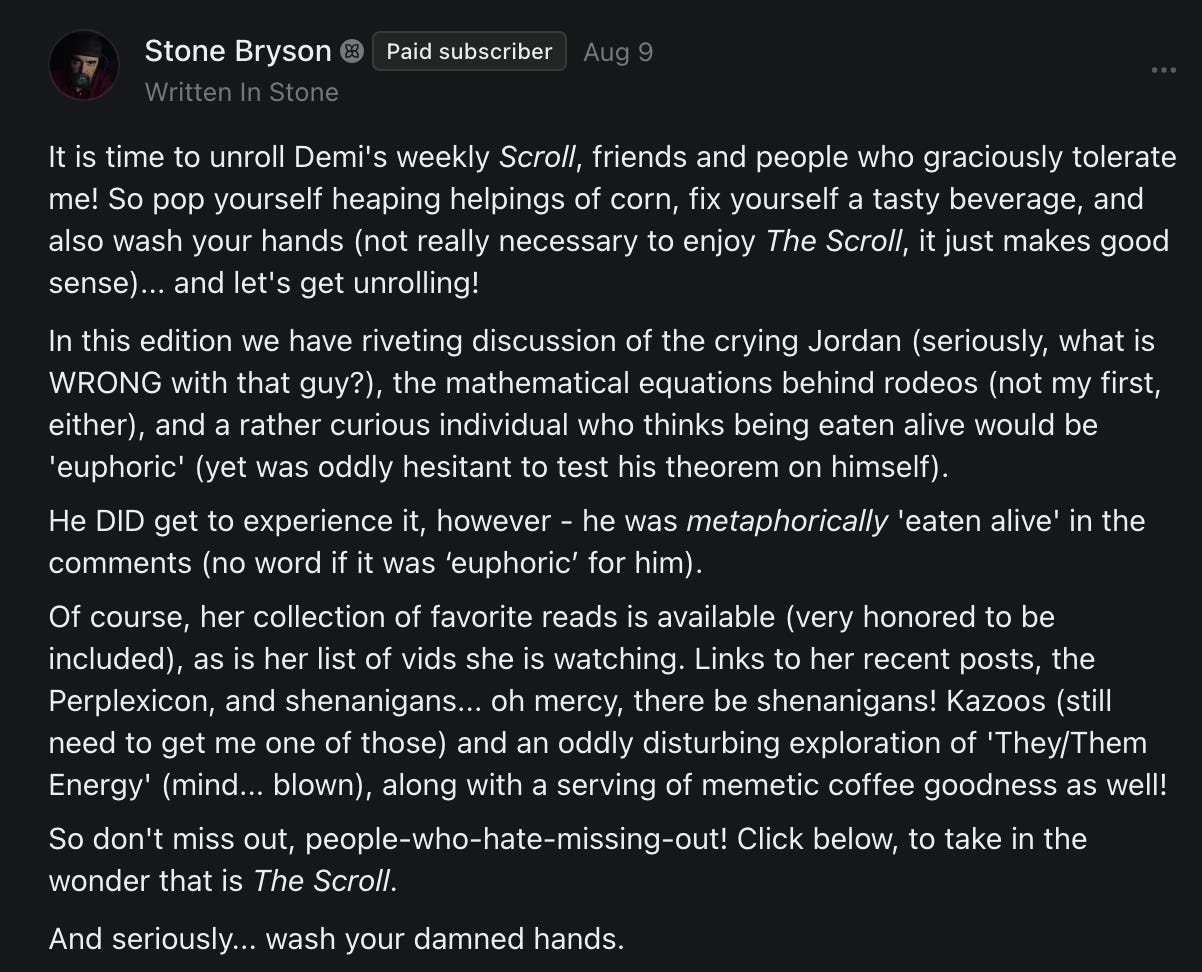 THE SCROLL is a weekly free-form multimedia stream of consciousness digest of interesting, informative, educational, and otherwise amusing posts and conversations from across Substack and amongst Substack writers and readers, carefully curated by the author.