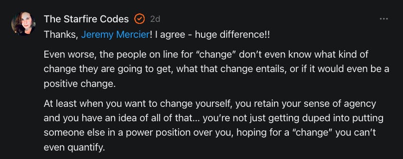 So just give everyone agency! A great idea, I am happy to help that cause as it is a major mission of mine as well haha, but it is naive to think it can be brought about quickly and (back to my earlier point) that everyone is even capable/desirous of it at all on this multifarious experience we call life.