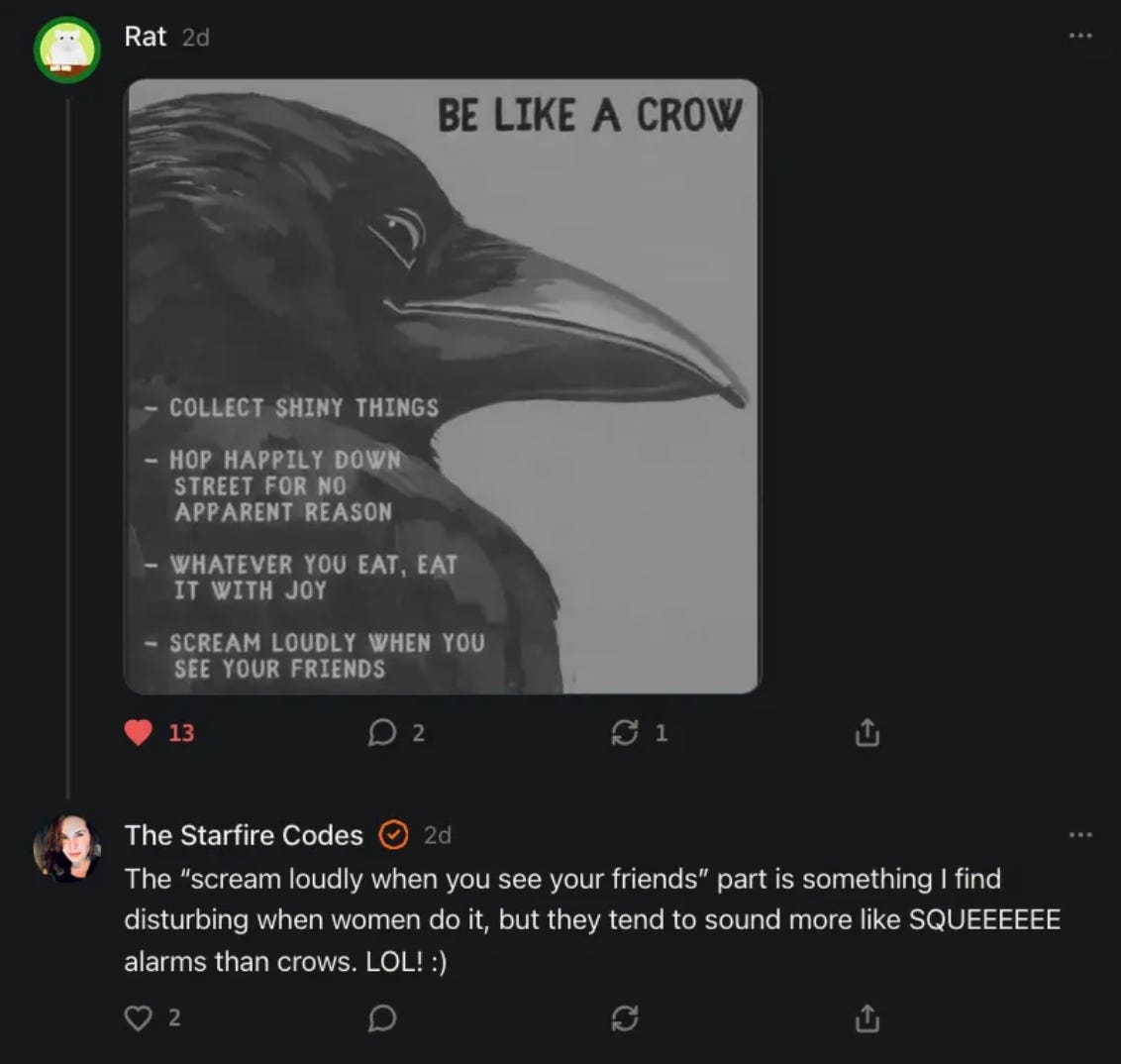 “I appreciate that! All credit to Starfire for always bringing that cosmic fiyah though. Happy if I can fan the flames a bit haha. Memes for the Meme God! Scrolls for the Scroll Throne! 👿🤘💀” -