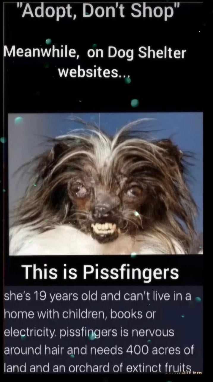 “Awwww Mrs. Pissfingers just needs some snuggles and I am sure she is a real sweetie pie. Well, snuggles... and that 400 acres of extinct fruits.” -