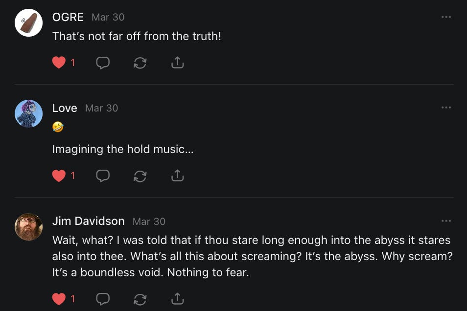 THANK YOU FOR CONTACTING THE ABYSS. YOUR SCREAM IS VERY IMPORTANT TO US.