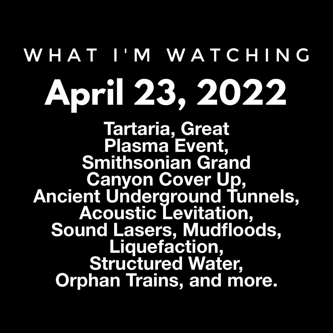 Tartaria, Great Plasma Event, Smithsonian Grand Canyon Cover Up, Ancient Underground Tunnels, Acoustic Levitation, Sound Lasers, Mudfloods, Liquefaction, Structured Water, Orphan Trains, and more.
