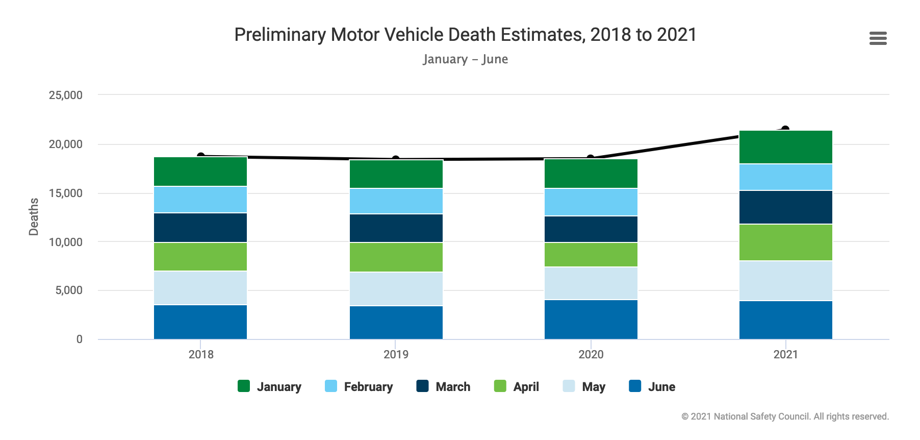 According to NSC, “The number of deaths for the first six months of 2021 are estimated to be 21,450. This preliminary estimate is up 16% compared to 2020 and up 17% compared to 2019.”